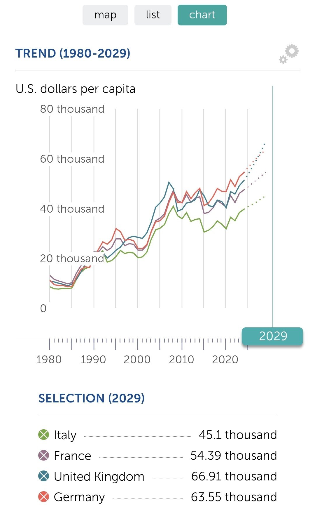 실제로 IMF 전망에서도 1인당 GDP의 흐름에서 독일이나 영국보다 이탈리아에 가까워지는 모습을 보이는데 귀추가 주목되는 상황