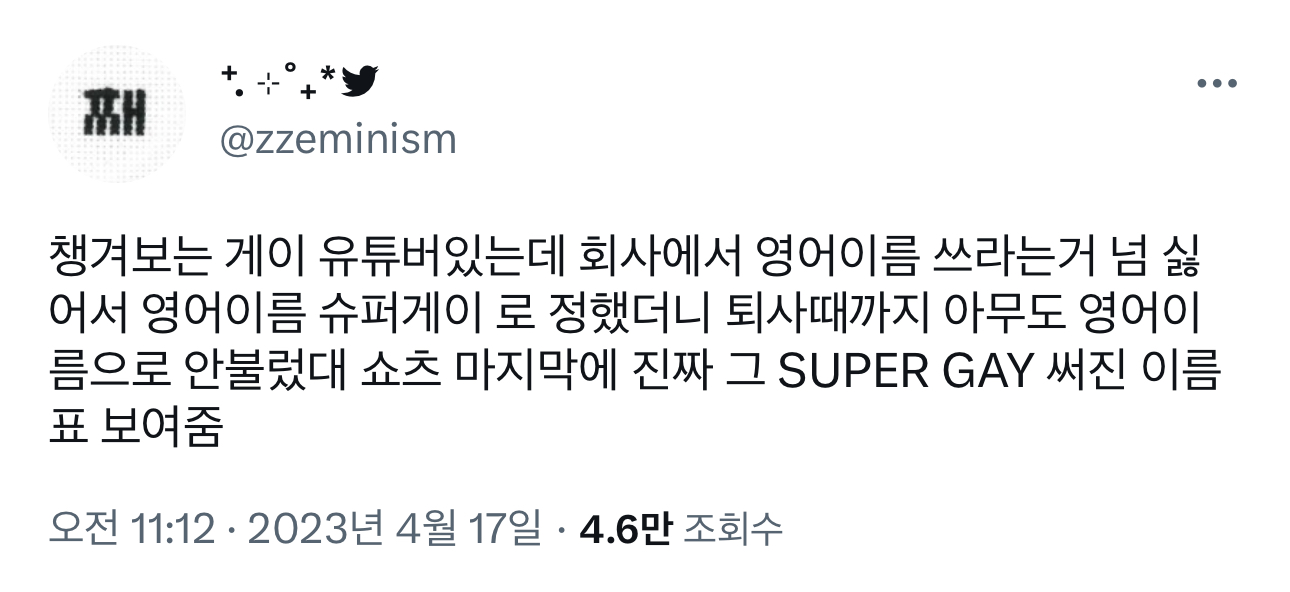 [스크랩] [흥미돋]챙겨보는 게이 유튜버있는데 회사에서 영어이름 쓰라는거 넘 싫어서 영어이름 슈퍼게이 로 정했더니 퇴사때까지 아무도 영어이름으로 안불렀대 작성자Everything|작성시간24.06.13|조회수13,179 목록 댓글 24 글자크기 작게가 글자크기 크게가 출처 : https://twitter.com/zzeminism/status/1647785088623710208?s=20 https://youtube.com/shorts/gs9GaBpaq58?feature=share회사에서 영어 이름 쓰기 오글거릴 때 가불기 (준비물: 게이)마이클 제임스 로버트 윌리엄 토마스 앤드류 피터 라이언 브라이언 제이 케빈 스콧 헨리 대니얼 매튜 데이비드는 가라www.youtube.com 다음검색 스크랩 원문 : *여성시대* 차분한 20대들의 알흠다운 공간 현재 게시글 추가 기능 열기 북마크 공유하기 신고 센터로 신고 댓글 댓글 24 댓글쓰기 답글쓰기 댓글 리스트 작성자소프트 우유크림 | 작성시간 24.06.13 ㅋㅋㅋㅋㅋㅋㅋㅋㅋㅋㅋ 작성자마음이 건강한 부자 | 작성시간 24.06.13 개쎄ㅋㅋㅋㄱㄱㅋㅋㄱㅋㅋㄱㅋㅋㅋ 작성자팽퀸 | 작성시간 24.06.13 슈퍼님~ 안하려낰ㅋㅋㅋㅋㅋ 작성자15:03 | 작성시간 24.06.13 수수수 수퍼 궤이~ 작성자옳아 | 작성시간 24.06.13 근데 난 부를 수 있을거같아 댓글 전체보기
