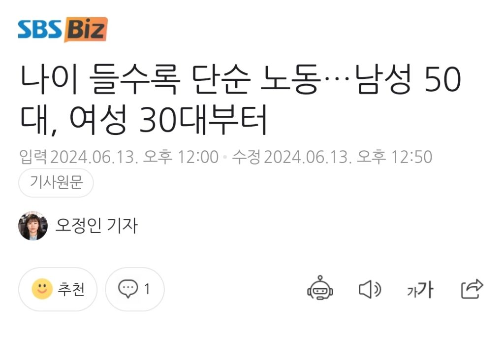 작성자but your friend 작성시간 24.06.13 왜겠냐? 애낳고 경력단절됐다가 다시 일할거 찾으려니까 안받아주고하니까 단순노동 쪽이라도 하는거아냐
