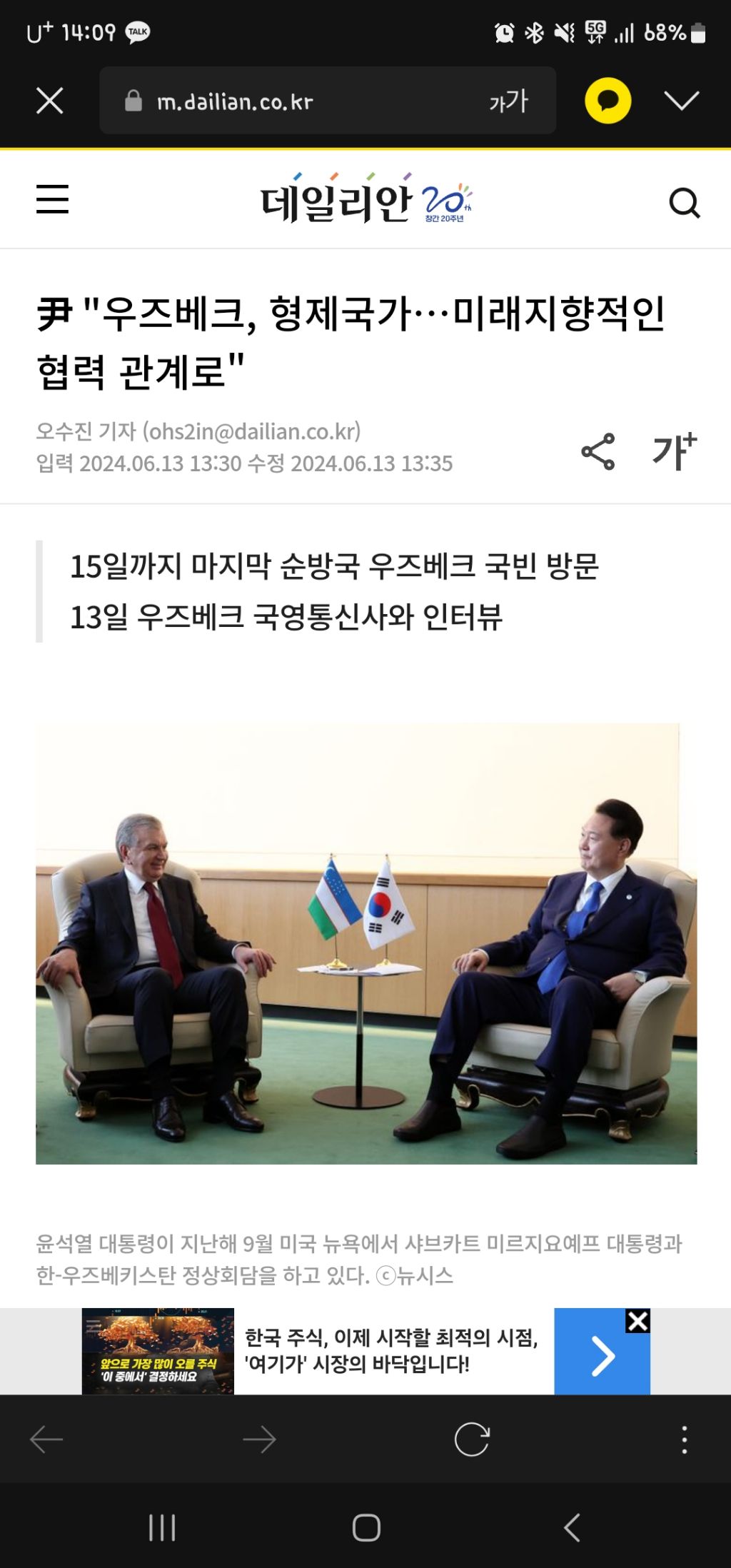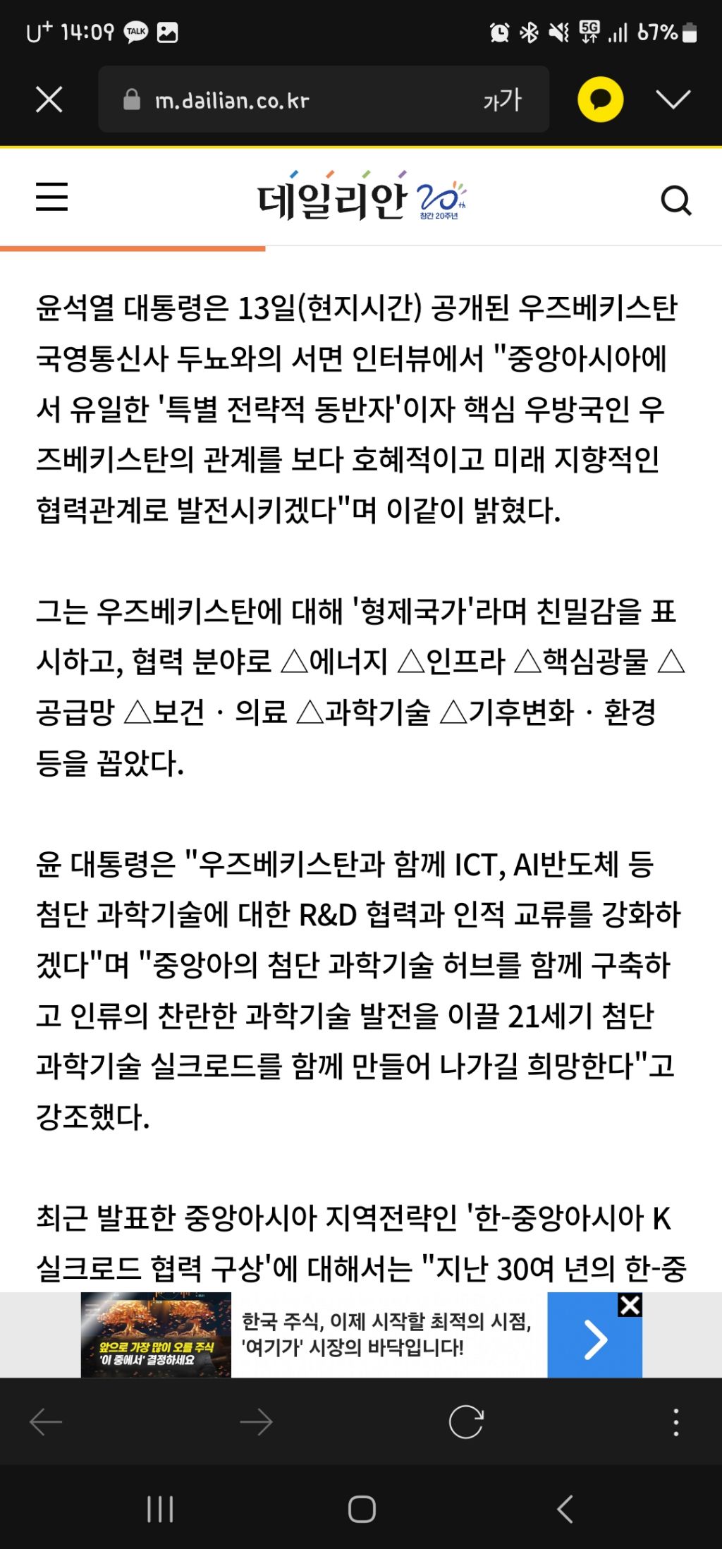 [여시뉴스데스크]尹 "우즈베크, 형제국가…미래지향적인 협력 관계로" 작성자구황작물깡|작성시간24.06.13|조회수411 목록 댓글 0 글자크기 작게가 글자크기 크게가 출처: https://www.dailian.co.kr/news/view/1371511/?sc=Naver尹 "우즈베크, 형제국가…미래지향적인 협력 관계로"중앙아시아 3국을 순방 중인 윤석열 대통령이 마지막 순방국인 우즈베키스탄에 대해 "글로벌 복합위기 속에서 양국간 경제 협력을 더욱 다변화하고 심화 발전시킬 수 있는 기회"라며 "이번 순방www.dailian.co.kr우즈베키스탄이 언제부터 형제국가였지...🧐전문출처~.~ 다음검색 현재 게시글 추가 기능 열기 북마크 공유하기 신고 센터로 신고 댓글 댓글 0 댓글쓰기 답글쓰기 댓글 리스트