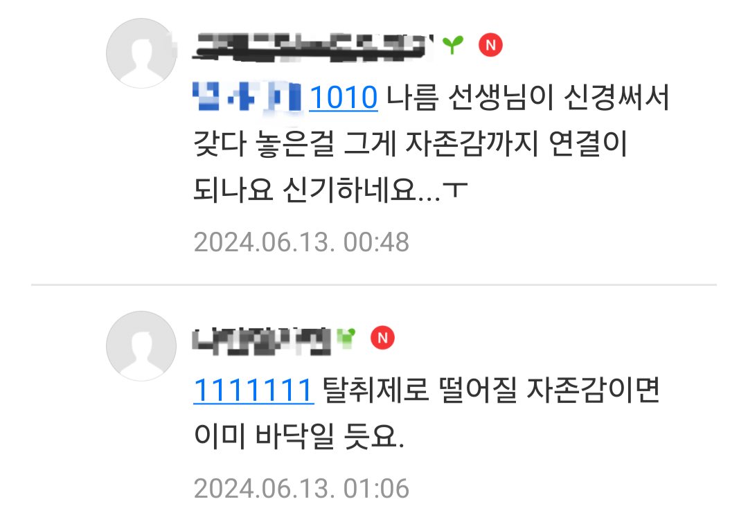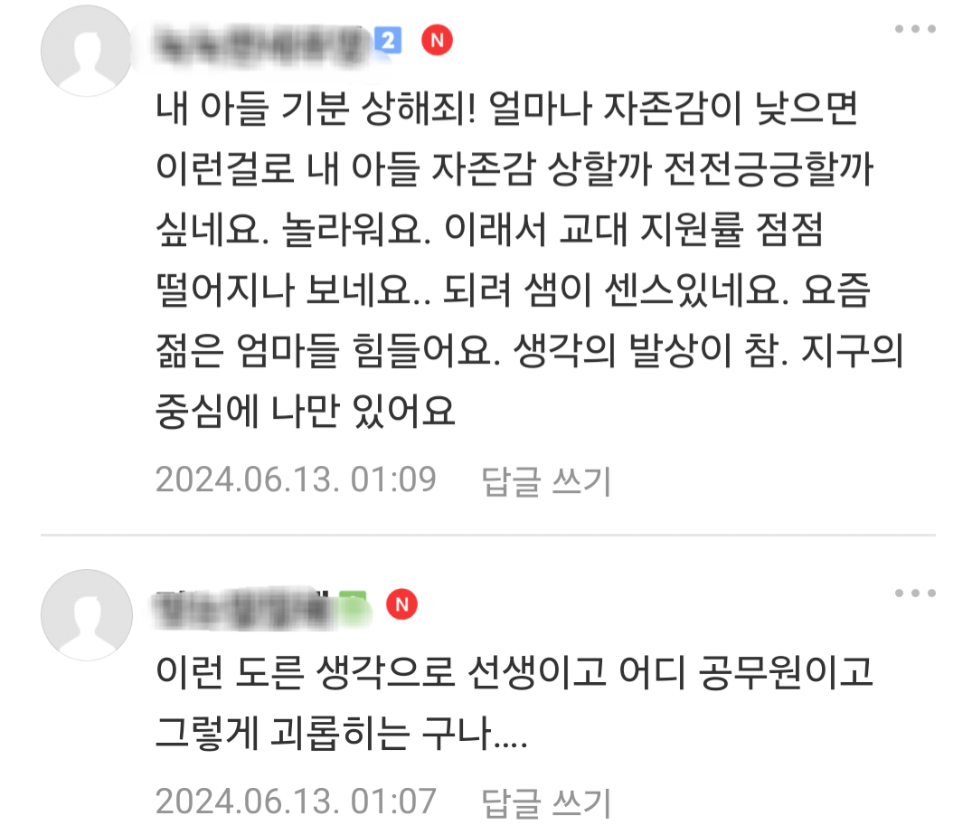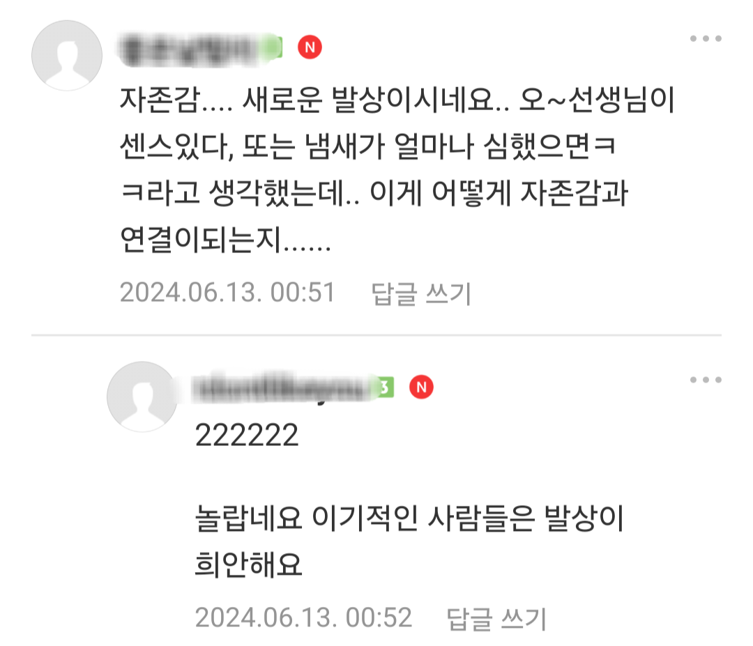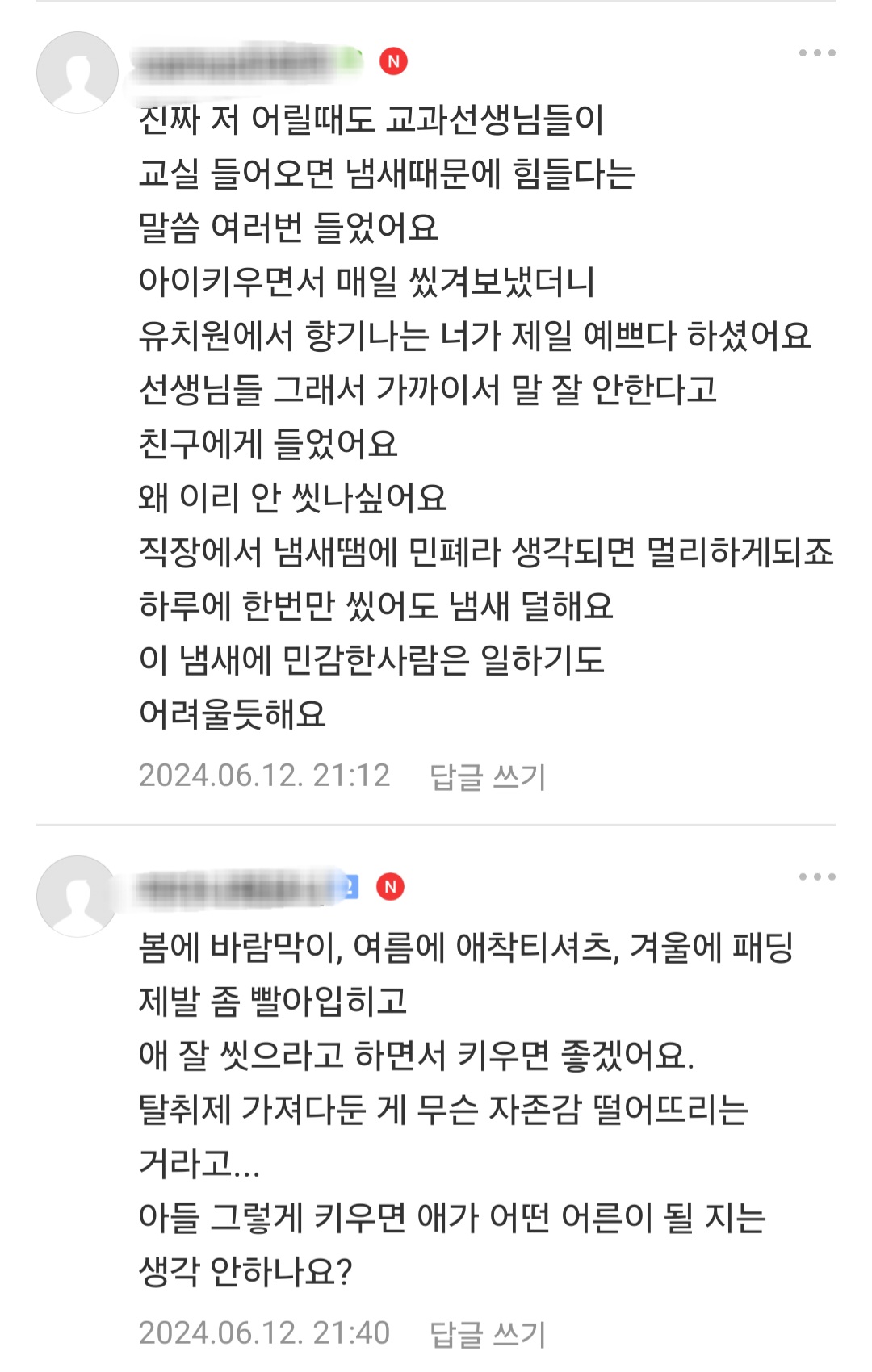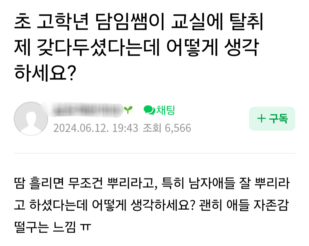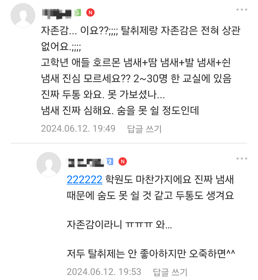 [흥미돋]초 고학년 담임쌤이 교실에 탈취제 갖다두셨다는데 어떻게 생각 하세요? 작성자library|작성시간24.06.13|조회수30,721 목록 댓글 251 글자크기 작게가 글자크기 크게가 출처: https://theqoo.net/square/3276096143더쿠 - 초 고학년 담임쌤이 교실에 탈취제 갖다두셨다는데 어떻게 생각 하세요?댓글 다 정상적이라 속시원 theqoo.net 다음검색 현재 게시글 추가 기능 열기 북마크 공유하기 신고 센터로 신고 댓글 댓글 251 댓글쓰기 답글쓰기 댓글 리스트 작성자Y닝투K | 작성시간 24.06.14 와 2일전 최근글이네^^역시^^ 작성자호아ㄲ이아라 | 작성시간 24.06.14 남자들은 성인이 돼도 제대로 씻지를 않으니까 너무 냄새나고 힘듦 옆에 남자지나가면 숨참음 작성자탈병원탈임상 | 작성시간 24.06.14 ? 고마워하세요 작성자키작남살인마 | 작성시간 24.06.14 헉 그래도 정상적인 엄마들이 훨씬많네 다행.. 작성자햇살살 | 작성시간 24.06.15 남학생들 냄새 진짜 좆됨 ㅅㅂ 겪어보기나 하고 하는말임? 댓글 전체보기