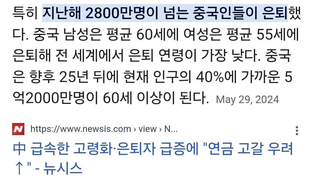 특히 중국의 노인인구가 2024년 현재 3억에, 8년후인 2032년에 4억, 은퇴인구로만 따지면 2034년에 6억을 달성해서 2035년 연금 파산까지 이르니 이는 한국 내지 그 이상으로 심각한 경제적 타격을 가져오게 됨.