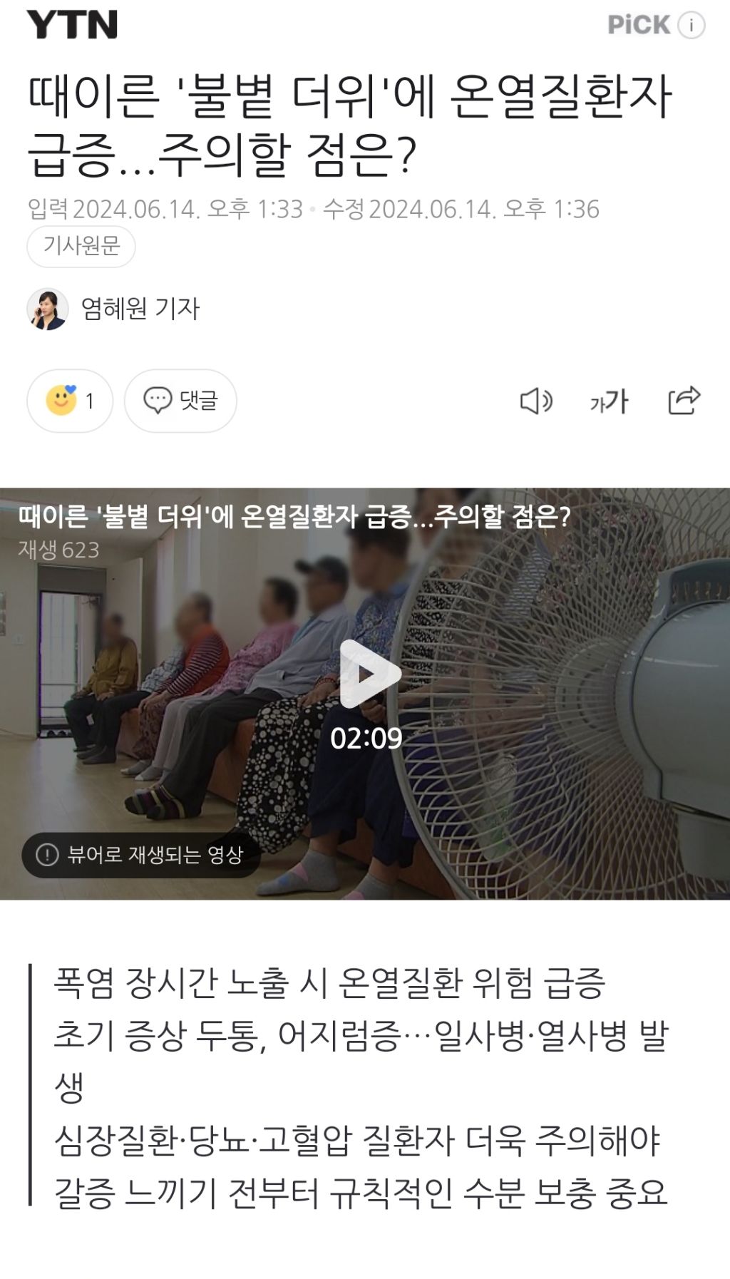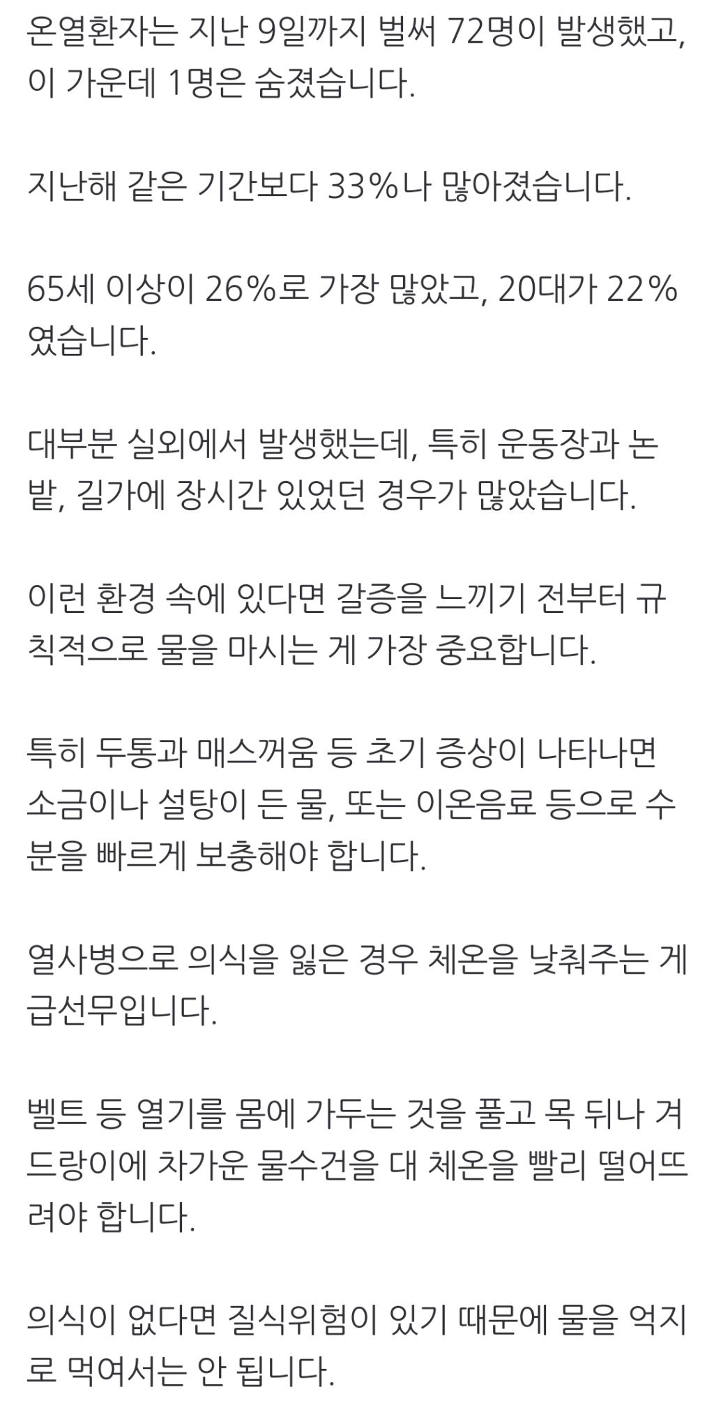 [여시뉴스데스크]때이른 '불볕 더위'에 온열질환자 급증...주의할 점은? 작성자천리길|작성시간24.06.14|조회수576 목록 댓글 1 글자크기 작게가 글자크기 크게가 출처: https://naver.me/Ixs5wUR0때이른 '불볕 더위'에 온열질환자 급증...주의할 점은?올여름 시작부터 더위가 심상치 않습니다. 벌써 두통과 의식저하 등의 증상을 보이는 온열 질환 환자가 늘고 있는데요. 어떤 점을 주의해야 하는지 염혜원 기자가 알려드립니다. [기자] 폭염 속n.news.naver.com전략이하 생략전문 출처로 다음검색 현재 게시글 추가 기능 열기 북마크 공유하기 신고 센터로 신고 댓글 댓글 1 댓글쓰기 답글쓰기 댓글 리스트 작성자고슴도치의 지난사랑이 | 작성시간 24.06.14 20대도 있네 진짜 위험하구나 댓글 전체보기