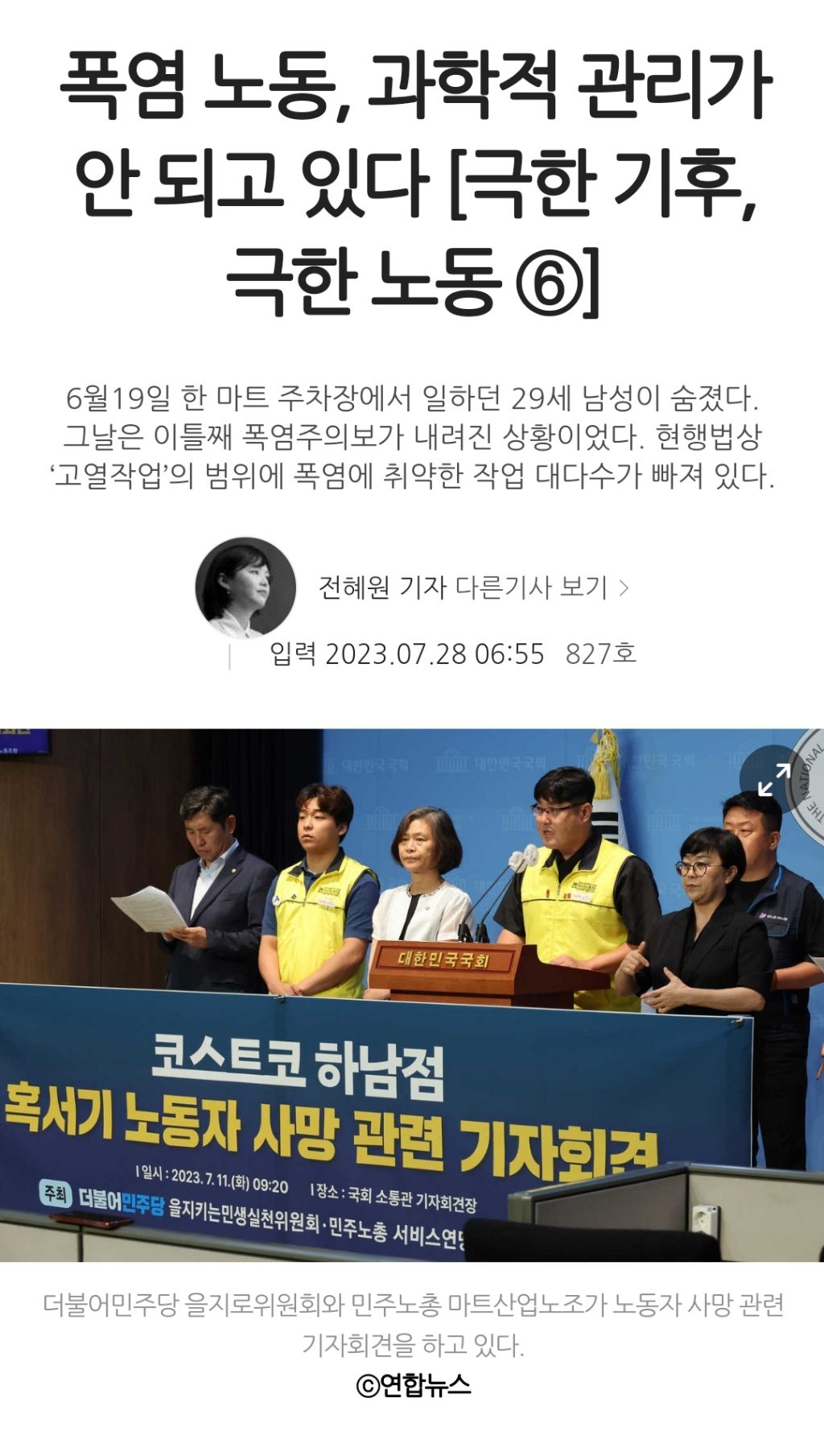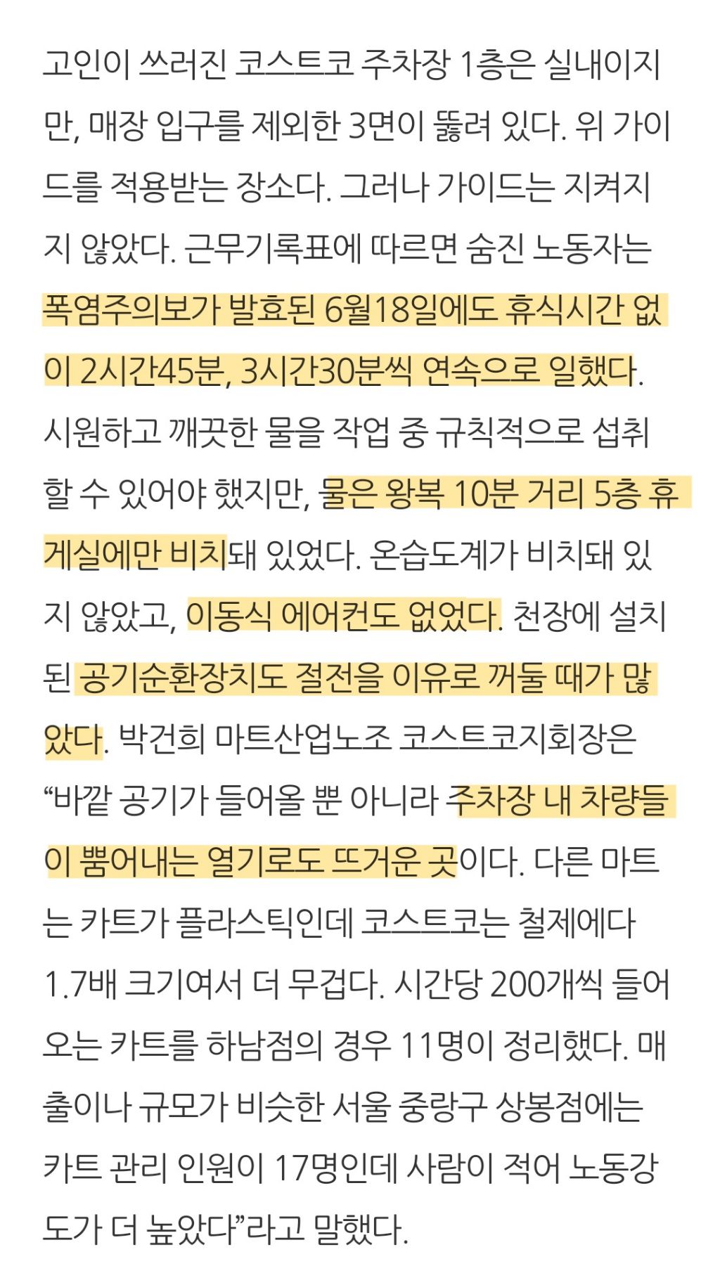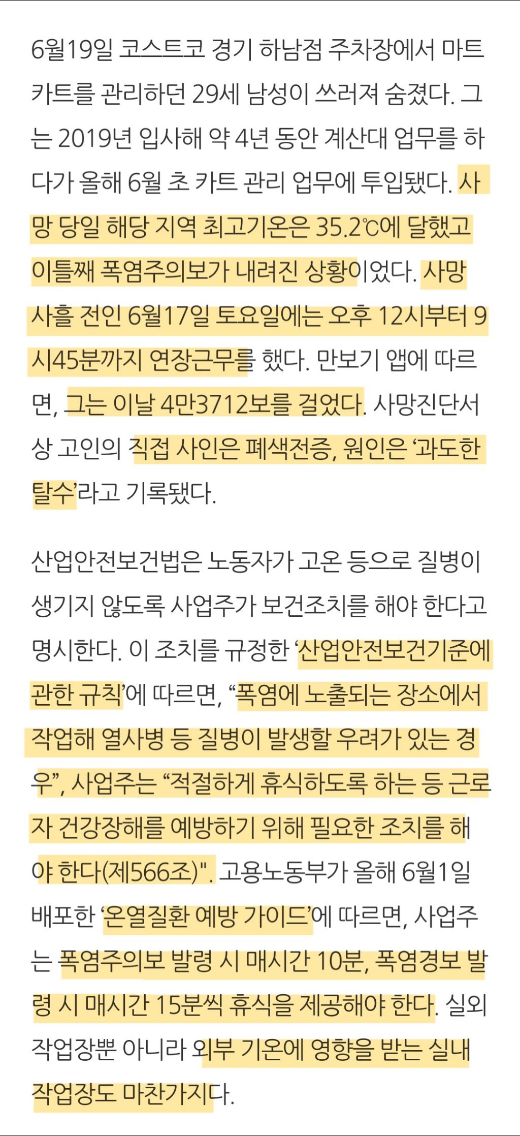 [스크랩] [여시뉴스데스크]폭염 노동, 과학적 관리가 안 되고 있다 [극한 기후, 극한 노동 ⑥] 작성자천리길|작성시간24.06.14|조회수611 목록 댓글 2 글자크기 작게가 글자크기 크게가 출처 : https://www.sisain.co.kr/news/articleView.html?idxno=50742폭염 노동, 과학적 관리가 안 되고 있다 [극한 기후, 극한 노동 ⑥] - 시사IN6월19일 코스트코 경기 하남점 주차장에서 마트 카트를 관리하던 29세 남성이 쓰러져 숨졌다. 그는 2019년 입사해 약 4년 동안 계산대 업무를 하다가 올해 6월 초 카트 관리 업무에 투입됐다. 사망 www.sisain.co.kr전문 출처로 다음검색 스크랩 원문 : *여성시대* 차분한 20대들의 알흠다운 공간 현재 게시글 추가 기능 열기 북마크 공유하기 신고 센터로 신고 댓글 댓글 2 댓글쓰기 답글쓰기 댓글 리스트 작성자천리길 작성자 본인 여부 작성자 | 작성시간 24.06.14 내가 알기론 사측 사과 아직 없었음 혹시 사과한 거 본 여시 있으면 알려줘 작성자무화과깜빠뉴 | 작성시간 24.06.14 폭염 장난 아닌데 ㅠ 댓글 전체보기