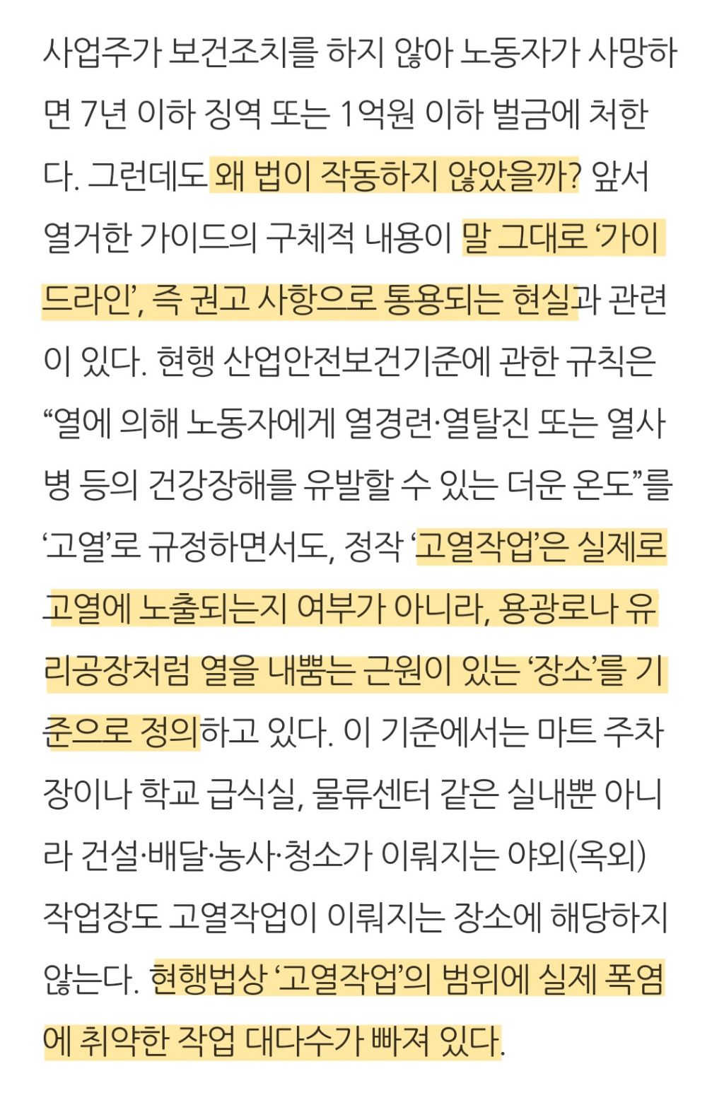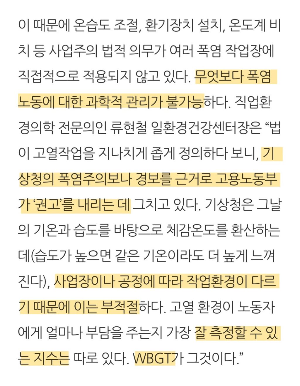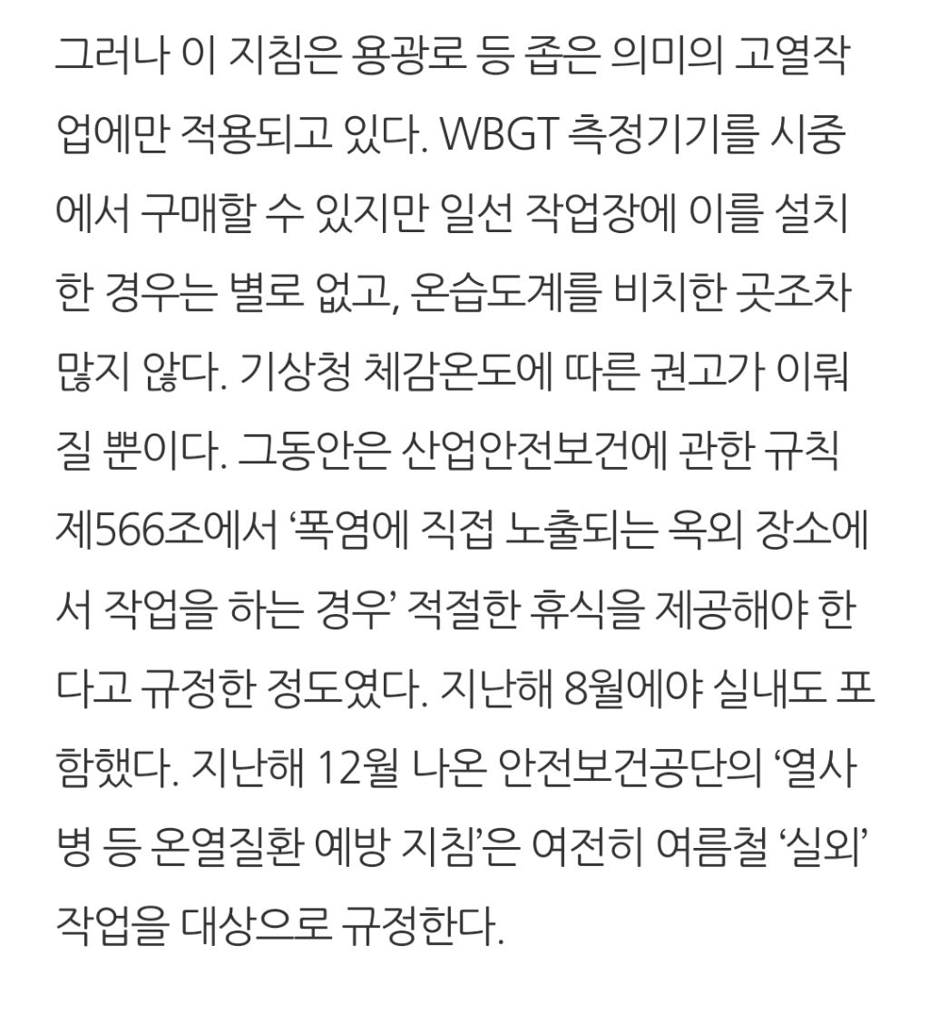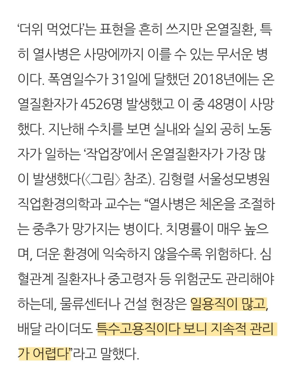 [스크랩] [여시뉴스데스크]폭염 노동, 과학적 관리가 안 되고 있다 [극한 기후, 극한 노동 ⑥] 작성자천리길|작성시간24.06.14|조회수611 목록 댓글 2 글자크기 작게가 글자크기 크게가 출처 : https://www.sisain.co.kr/news/articleView.html?idxno=50742폭염 노동, 과학적 관리가 안 되고 있다 [극한 기후, 극한 노동 ⑥] - 시사IN6월19일 코스트코 경기 하남점 주차장에서 마트 카트를 관리하던 29세 남성이 쓰러져 숨졌다. 그는 2019년 입사해 약 4년 동안 계산대 업무를 하다가 올해 6월 초 카트 관리 업무에 투입됐다. 사망 www.sisain.co.kr전문 출처로 다음검색 스크랩 원문 : *여성시대* 차분한 20대들의 알흠다운 공간 현재 게시글 추가 기능 열기 북마크 공유하기 신고 센터로 신고 댓글 댓글 2 댓글쓰기 답글쓰기 댓글 리스트 작성자천리길 작성자 본인 여부 작성자 | 작성시간 24.06.14 내가 알기론 사측 사과 아직 없었음 혹시 사과한 거 본 여시 있으면 알려줘 작성자무화과깜빠뉴 | 작성시간 24.06.14 폭염 장난 아닌데 ㅠ 댓글 전체보기