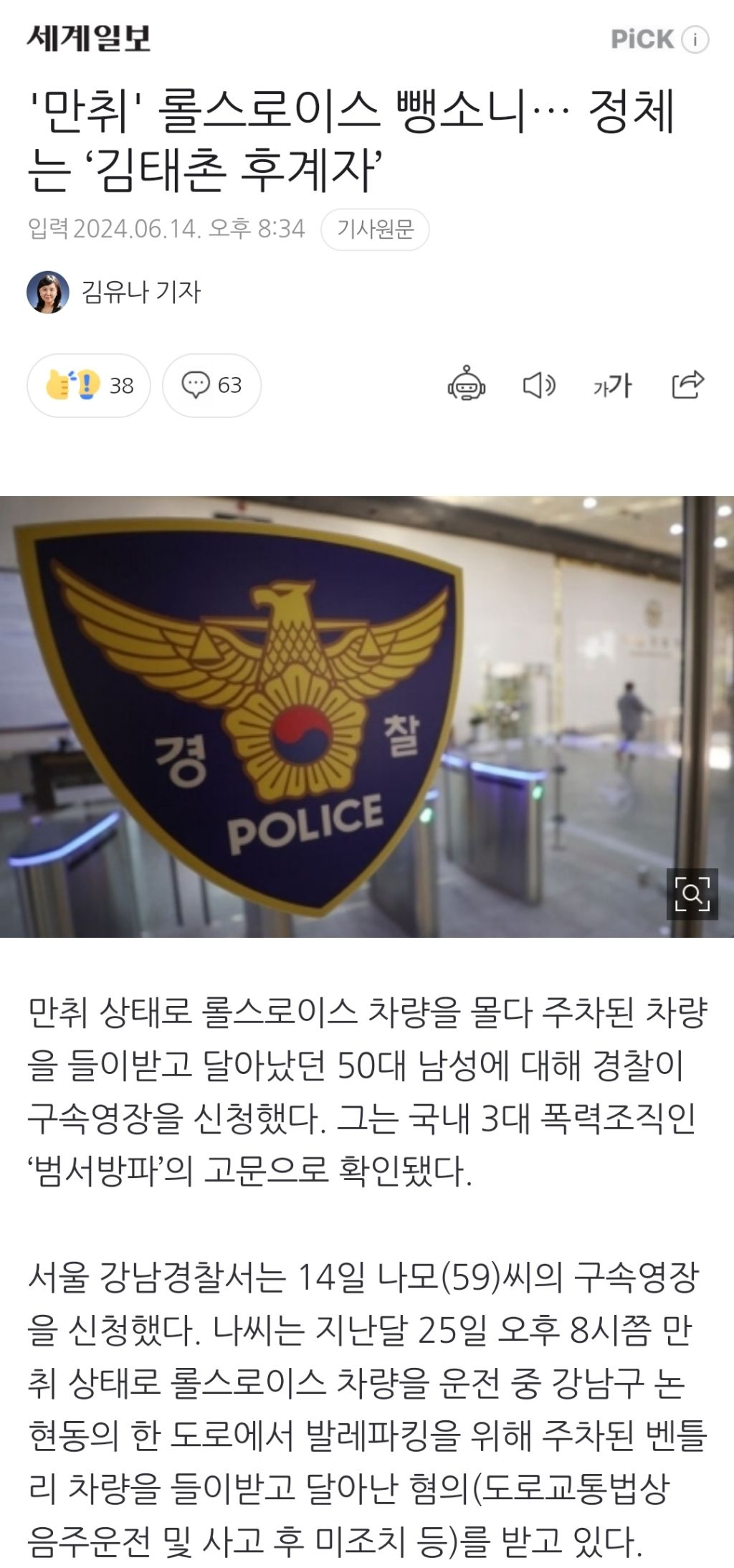 [여시뉴스데스크]'만취' 롤스로이스 뺑소니… 정체는 ‘김태촌 후계자’ 작성자천리길|작성시간24.06.15|조회수12,540 목록 댓글 5 글자크기 작게가 글자크기 크게가 출처: https://naver.me/xDJN6b3V'만취' 롤스로이스 뺑소니… 정체는 ‘김태촌 후계자’만취 상태로 롤스로이스 차량을 몰다 주차된 차량을 들이받고 달아났던 50대 남성에 대해 경찰이 구속영장을 신청했다. 그는 국내 3대 폭력조직인 ‘범서방파’의 고문으로 확인됐다. 서울 강남n.news.naver.com이하 생략전문 출처로 다음검색 현재 게시글 추가 기능 열기 북마크 공유하기 신고 센터로 신고 댓글 댓글 5 댓글쓰기 답글쓰기 댓글 리스트 작성자정신력으로버텨라 | 작성시간 24.06.15 진짜 가지가지 처하네 작성자예쁜거보자 | 작성시간 24.06.15 하… 작성자닥스 | 작성시간 24.06.15 요즘도 저런 파가 잇네 작성자아니근데대체왜? | 작성시간 24.06.15 가지가지해라 새끼야 작성자hwangheechan | 작성시간 24.06.15 읭 그 피바다 김태촌..? ;; 댓글 전체보기
