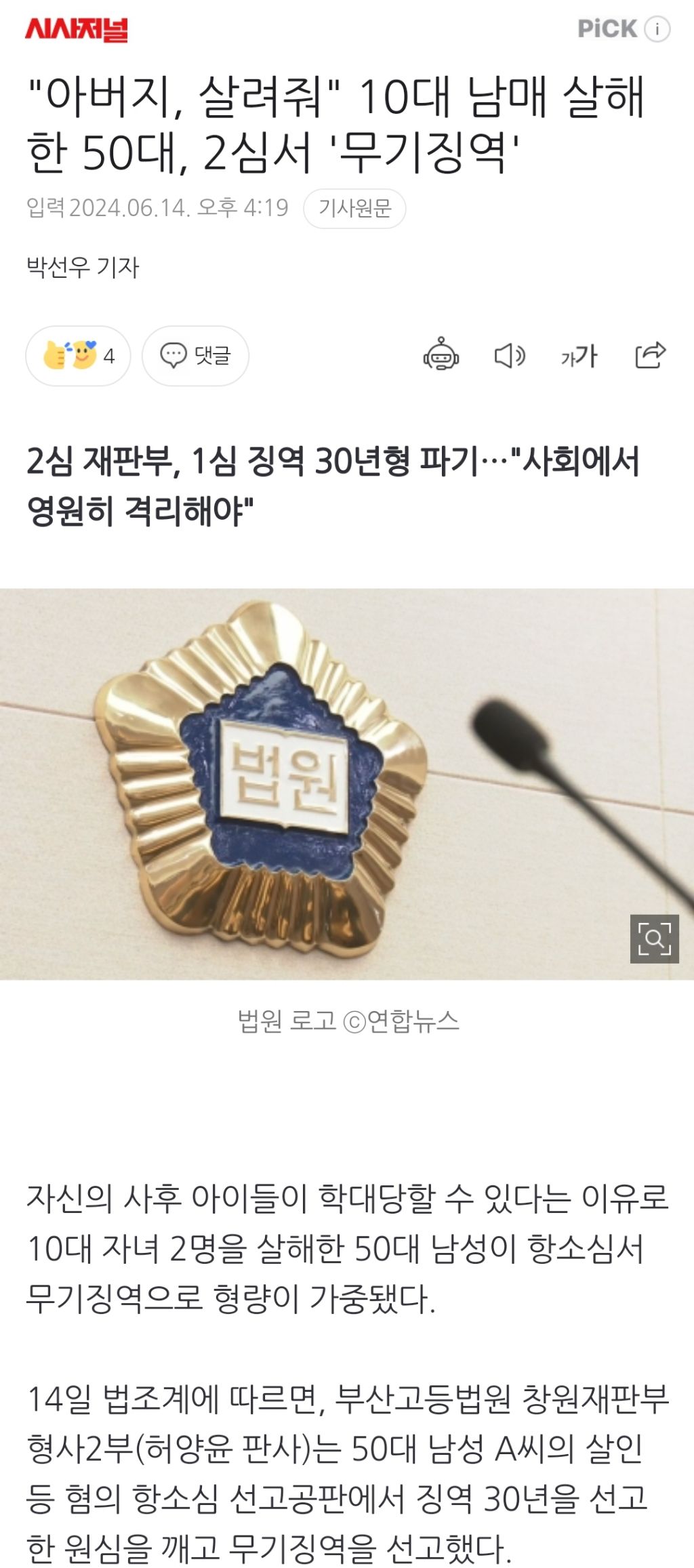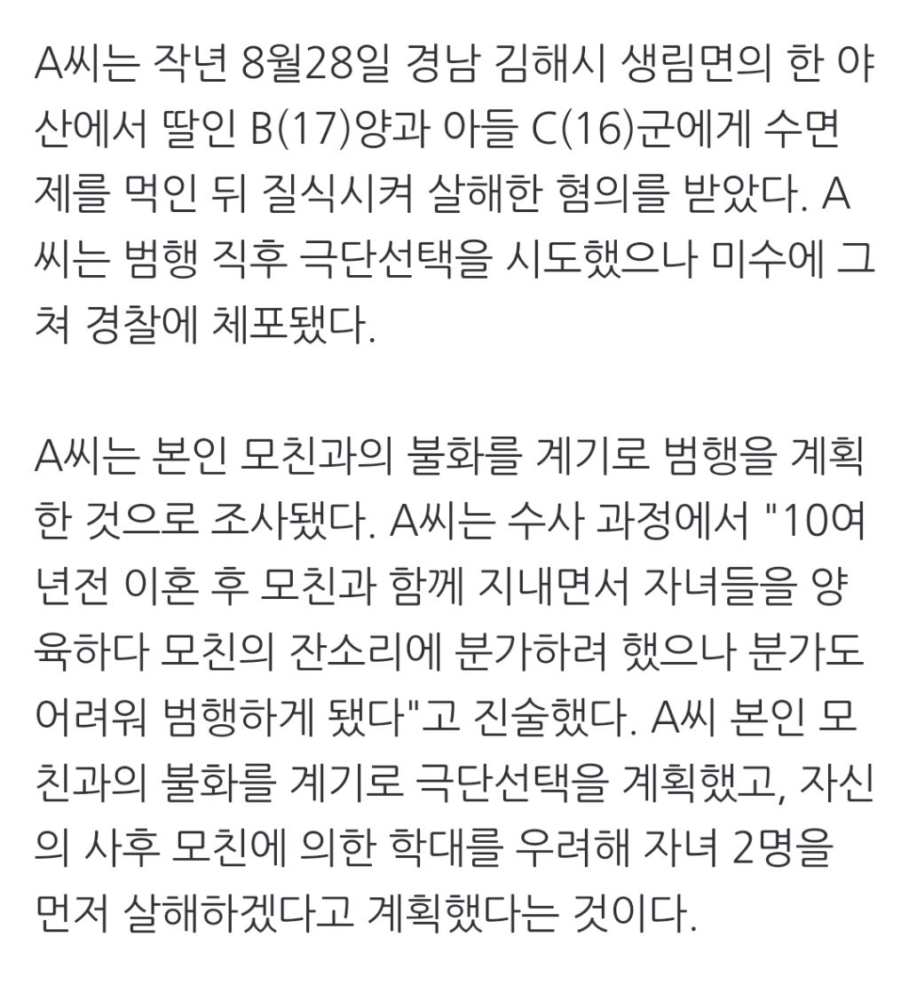 [여시뉴스데스크]"아버지, 살려줘" 10대 남매 살해한 50대, 2심서 '무기징역' 작성자천리길|작성시간24.06.15|조회수2,079 목록 댓글 6 글자크기 작게가 글자크기 크게가 출처: https://naver.me/xmxjrOkC"아버지, 살려줘" 10대 남매 살해한 50대, 2심서 '무기징역'2심 재판부, 1심 징역 30년형 파기…"사회에서 영원히 격리해야" 자신의 사후 아이들이 학대당할 수 있다는 이유로 10대 자녀 2명을 살해한 50대 남성이 항소심서 무기징역으로 형량이 가중됐다. 14n.news.naver.com이하 생략전문 출처로 다음검색 현재 게시글 추가 기능 열기 북마크 공유하기 신고 센터로 신고 댓글 댓글 6 댓글쓰기 답글쓰기 댓글 리스트 작성자탕슈슉슈육 | 작성시간 24.06.15 하 핑계도 가지가지 그냥 천륜을 저버린 살인자임 애들이 너무 불쌍하다.. 작성자ISLAND | 작성시간 24.06.15 말도 안되는 핑계다 진짜.. 작성자슬멍술멍 | 작성시간 24.06.15 제발 뒤질거면 혼자 뒤져 작성자야 형욱이 지나간다 | 작성시간 24.06.15 미친새끼…지새끼들 죽이고 그걸 또 항소를 했네 작성자시핥 | 작성시간 24.06.15 뒤질거면 지 혼자 뒤져야지 댓글 전체보기