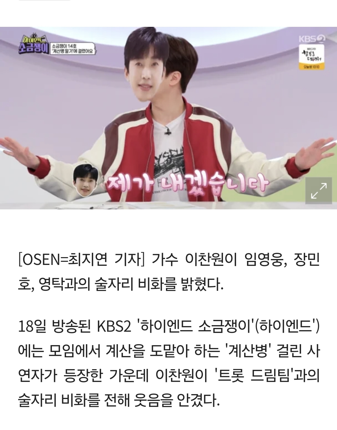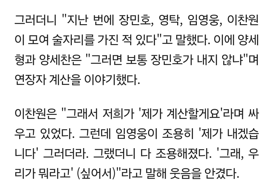 [여시뉴스데스크]이찬원 "과거 술자리서 장민호, 영탁과 싸워··임영웅 한 마디에 정리" ('하이엔드') [Oh!쎈 리뷰] 작성자말랑말롱|작성시간24.06.19|조회수13,568 목록 댓글 41 글자크기 작게가 글자크기 크게가 출처: https://m.news.nate.com/view/20240618n41326?mid=e02(중략)전문 출처로 다음검색 현재 게시글 추가 기능 열기 북마크 공유하기 신고 센터로 신고 댓글 댓글 41 댓글쓰기 답글쓰기 댓글 리스트 작성자보로봉붕 | 작성시간 24.06.19 우리가 뭐라곸ㅋㅋㅋㅋㅋㅋㅋㅋㅋㅋㅋ 작성자반짝이는워터멜론꼭봐 | 작성시간 24.06.19 그래 영웅이가 좀 내라 ~~ 작성자13호 | 작성시간 24.06.19 ㅋㅋㅋㅋㅋㅋㅋㅋㅋㅋㅋㅋㅋㅋㅋㅋ상대는 임영웅인것을.. 작성자남유주 | 작성시간 24.06.19 ㅅㅂㅋㅋㅋㅋ 작성자아!라텍스형 | 작성시간 24.06.19 ㅋㅋㅋㅋㅋㅋㅋㅋㅋㅋ 댓글 전체보기