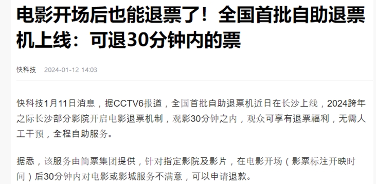 중국에서 24년 1월 1일부터 영화 상영 후에도 고객이 원하면 티켓 전액을 무료로 환불해주기 시작