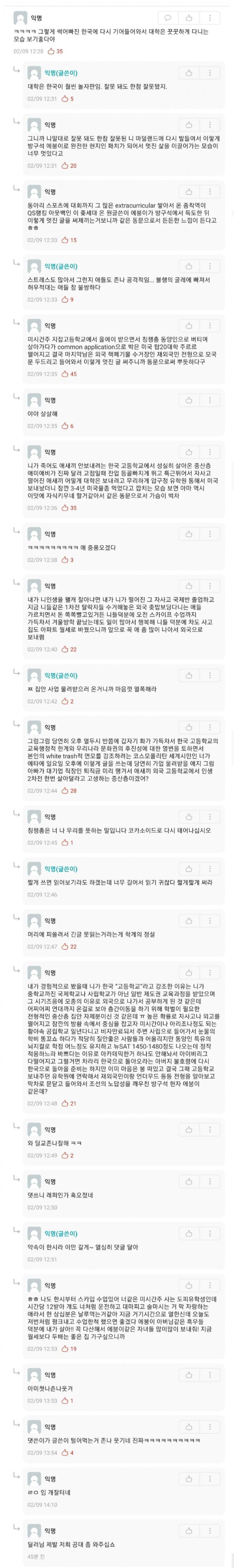 작성자로보청소 작성시간 24.06.21 진짜 속이 시원하다ㅋㅋㅋㅋㅋ 굳이 동문들도 있는데 다니는학교에다가 저말하는거보면 뼛속까지 열등감에 차있고 적응도 제대로 못하는거같음 불쌍ㅋㅋㅋㅋㅋㅋ+저 댓글 단 사람들이 글쓴이보다 훨씬 공부잘할듯 그게 팩트