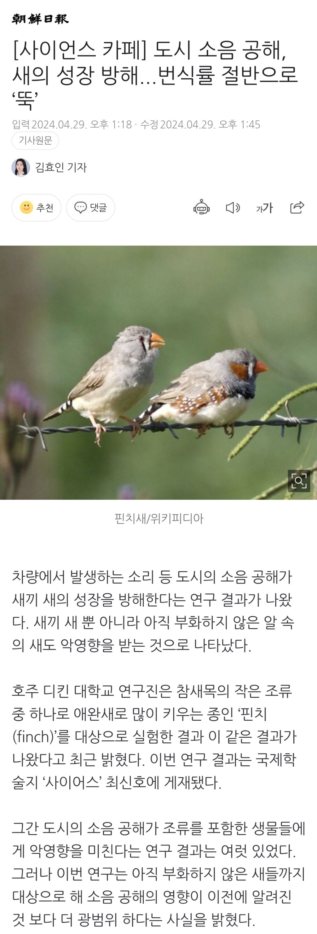 [스크랩] [여시뉴스데스크]도시 소음 공해, 새의 성장 방해...번식률 절반으로 ‘뚝’ 작성자천리길|작성시간24.06.23|조회수2,601 목록 댓글 3 글자크기 작게가 글자크기 크게가 출처: https://naver.me/F8btw4mo[사이언스 카페] 도시 소음 공해, 새의 성장 방해...번식률 절반으로 ‘뚝’차량에서 발생하는 소리 등 도시의 소음 공해가 새끼 새의 성장을 방해한다는 연구 결과가 나왔다. 새끼 새 뿐 아니라 아직 부화하지 않은 알 속의 새도 악영향을 받는 것으로 나타났다. 호주 디n.news.naver.com이하 생략전문 출처로 다음검색 스크랩 원문 : *여성시대* 차분한 20대들의 알흠다운 공간 현재 게시글 추가 기능 열기 북마크 공유하기 신고 센터로 신고 댓글 댓글 3 댓글쓰기 답글쓰기 댓글 리스트 작성자오잉히히 | 작성시간 24.06.23 인간이문제다... 작성자밀크티야맡아봐 | 작성시간 24.06.23 근데왜 둘기들은 더많아지죠...?ㅜ 작성자넘나이쁜것 | 작성시간 24.06.23 새 고양이가 다 죽인다며ㅋㅋㅋ 댓글 전체보기