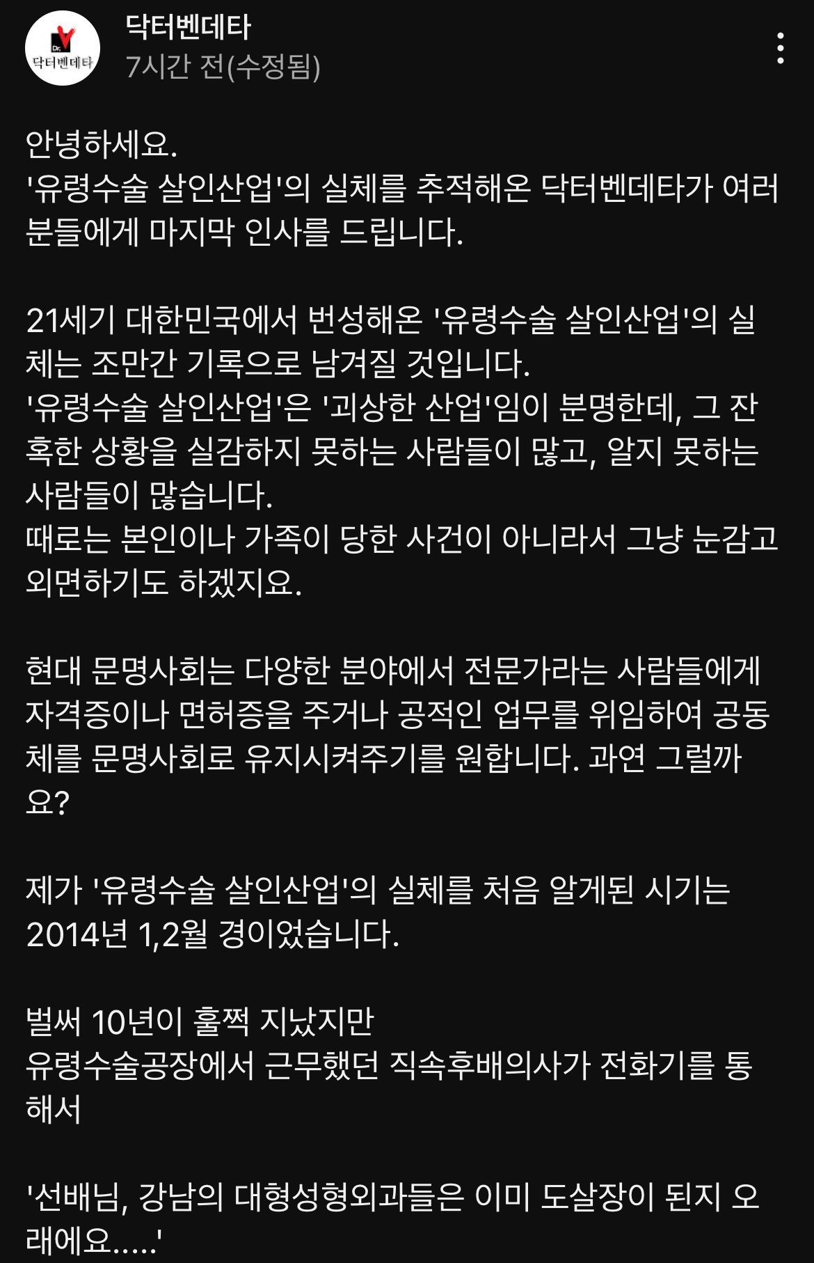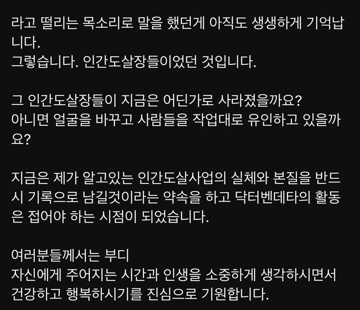[눈물한방울]대한민국의 ”유령수술 살인산업“의 실체를 밝히기 위해 노력하던 ”닥터벤데타“의 마지막 인사