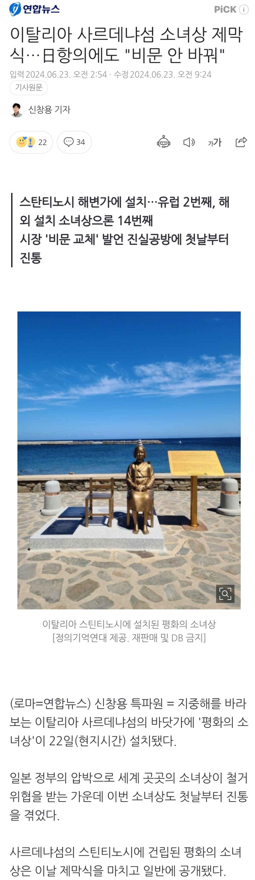 [여시뉴스데스크]이탈리아 사르데냐섬 소녀상 제막식…日항의에도 "비문 안 바꿔" 작성자천리길|작성시간24.06.23|조회수1,420 목록 댓글 4 글자크기 작게가 글자크기 크게가 출처: https://naver.me/G8sE1qtl이탈리아 사르데냐섬 소녀상 제막식…日항의에도 "비문 안 바꿔"스탄티노시 해변가에 설치…유럽 2번째, 해외 설치 소녀상으론 14번째 시장 '비문 교체' 발언 진실공방에 첫날부터 진통 신창용 특파원 = 지중해를 바라보는 이탈리아 사르데냐섬의 바닷가에 '평n.news.naver.com이하 생략전문 출처로🔗관련 기사https://naver.me/F1rbFwxX독일 소녀상 철거 위기 속에…이탈리아에 소녀상 생긴다일본군 위안부 피해를 기리는 '평화의 소녀상'이 이탈리아에 처음으로 들어섭니다. 현지시간으로 오는 22일 이탈리아 사르데냐 섬 스틴티노시에 '평화의 소녀상'을 세운다고 정의기억연대는 오n.news.naver.comhttps://naver.me/52RXSUu1유럽 두 번째 소녀상, 이탈리아서 공개…日항의에도 "철거 생각 없어"이탈리아에 일본군성노예 희생자를 기리는 '평화의 소녀상'이 세워졌다. 22일(현지시간) 이탈리아 매체 유니오네사르다에 따르면 이날 이탈리아 사르데냐섬 스틴티노시의 콜롬보 해안에서 소녀n.news.naver.comhttps://naver.me/FCAvoDKV[단독] 이탈리아 스틴티노시 "평화의 소녀상 비문, 안 바꾼다"이탈리아 현지에 설치된 평화의소녀상 비문의 내용이 편향됐다는 일본 측 항의에 대해, 스틴티노 시가 "문장을 바꿀 계획이 없다"고 밝혔습니다. 이탈리아 사르데냐 스틴티노 시의 리타 발레벨n.news.naver.comhttps://naver.me/5Q32kS1j소녀상 건립 伊시장 "한일 입장 병기해 비문 교체" 발언 진실공방(종합3보)日 교도통신, 스틴티노 시장 발언 인용해 보도…정의연 "시장, 비문 고칠 계획 없다고 말해" 이탈리아 스틴티노시에서 오늘 제막식…한국대사관 "필요시 적절한 대응 검토" 박성진 신창용 특파n.news.naver.comhttps://naver.me/GCvPLFlQ伊 해변가에 세워진 소녀상…日항의에도 "보편적 여성인권 문제"(종합)사르데냐섬 제막식…스탄티노 시장 "우크라 등 전쟁폭력 고통받는 전세계 모든 여성 대표해" 일본 대사관, 비문 문구 제기하며 행사 연기 요청…비문교체 진실공방 등 '순탄치 않은 출발' 유럽 2n.news.naver.com 다음검색 현재 게시글 추가 기능 열기 북마크 공유하기 신고 센터로 신고 댓글 댓글 4 댓글쓰기 답글쓰기 댓글 리스트 작성자하리보 초코맛 | 작성시간 24.06.23 ㅠㅠㅠㅠㅠ 보편적 여성인권 문제라면서 안 없앤다니 다행이다 작성자맞다이로들어오ㅏ | 작성시간 24.06.23 원숭이새끼들 왜케 발작해진짜 ㅋ 가만히있는 소녀상이 일본인지나가면 벌떡일어나서 칼침놓냐? 작성자대도서관 | 작성시간 24.06.23 고맙다 이탈리아 작성자삼랑 | 작성시간 24.06.23 고마워 이탈리아 댓글 전체보기