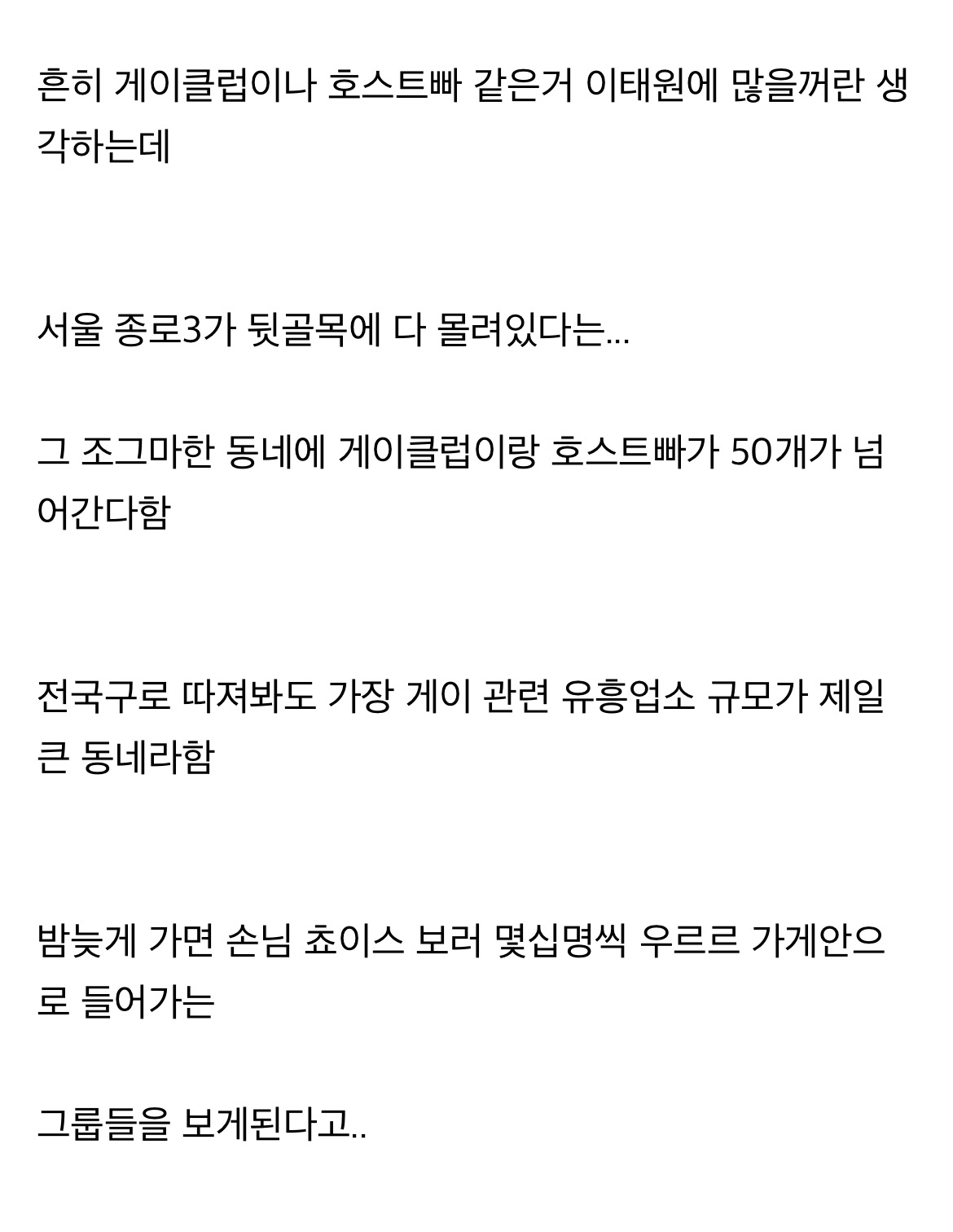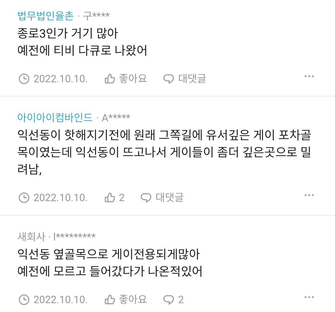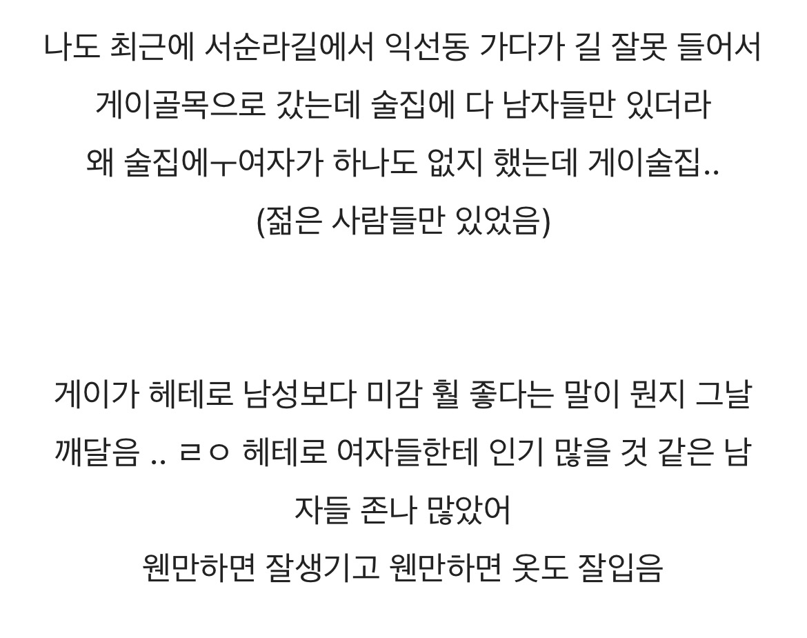 작성자Good Fellas 작성시간 24.06.23 내친구도 얼마전에 종로에서 술먹다가 똑같은 스타일 남자들만 줄줄이 들어가는 술집 봤다더라 (하도 털보들만 들어가서 무슨 종친회하는줄 알앗다고함) 혼성무리 오면 사장이 칼같이돌려보내고