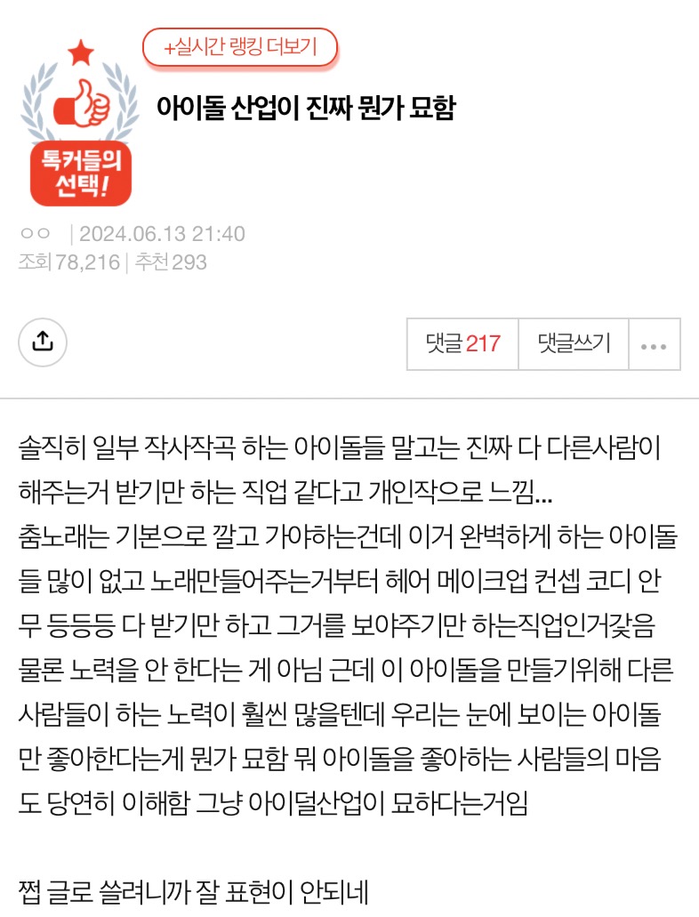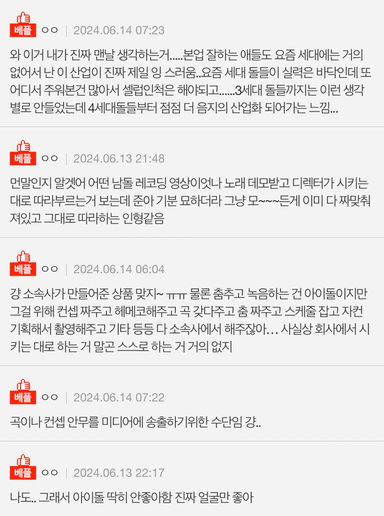 작성자rozowo 작성시간 24.06.24 직장인은 스탶이지만 아이돌은 그냥 상품이지 그게 살아있고 숨쉬는 사람일뿐이고