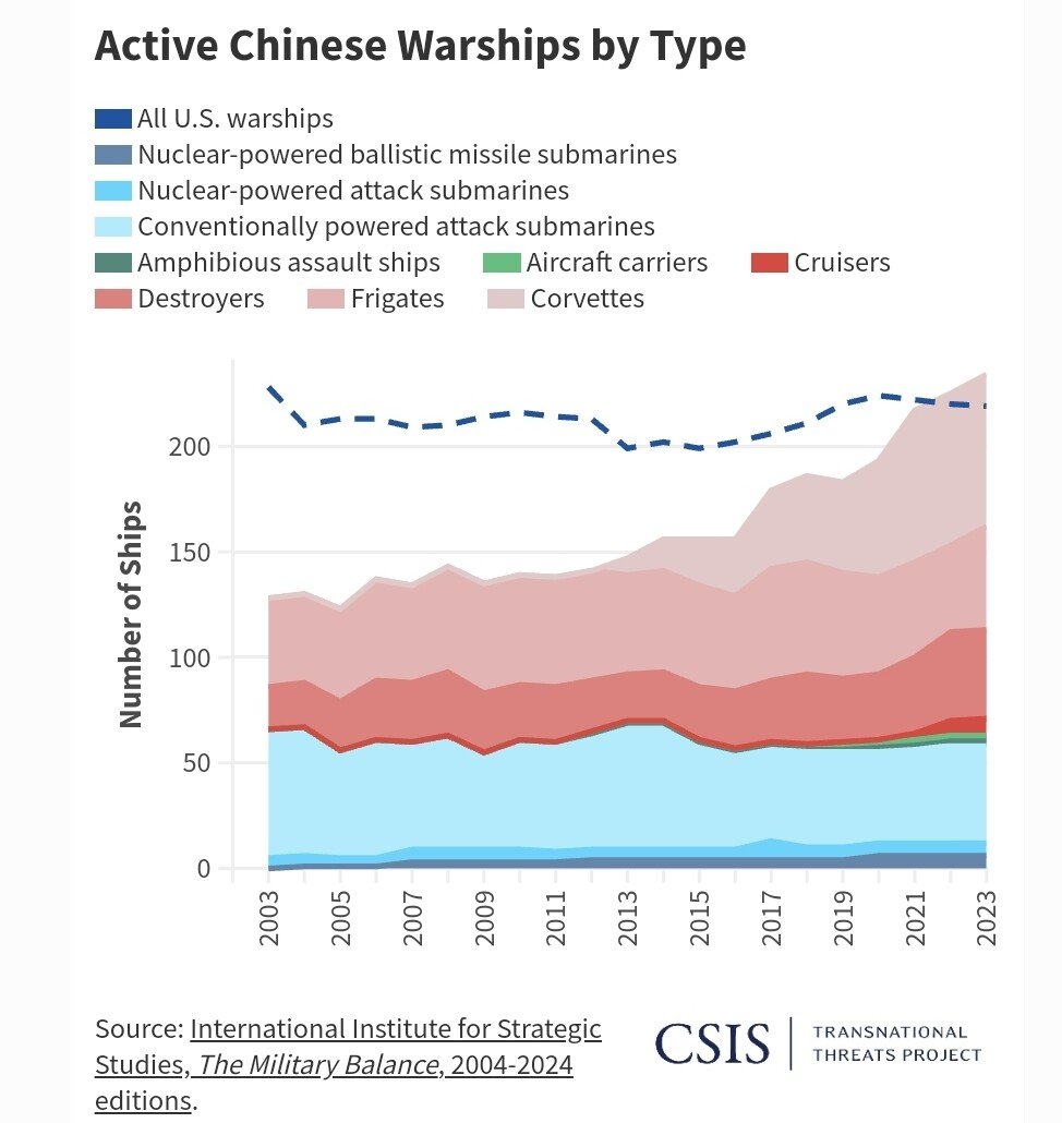 중국은 2003년 20대의 구축함을 보유 했으나, 2023년엔 42대를 보유하고 있다. 미국은 지난 20년간 11대의 구축함만을 진수한데 비해, 중국은 23대를 진수시켰다.