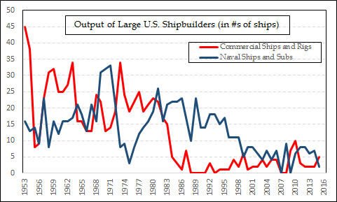 사실 미국 해군력 절대 우위의 쇠락은 되돌리기 힘들 지경까지 오고 말았다. 미국 해군력 우위가 쇠락을 겪은것은 이미 수십년에 걸쳐서 일어난 일이며, 산업의 변화를 전혀 못따라잡았다.