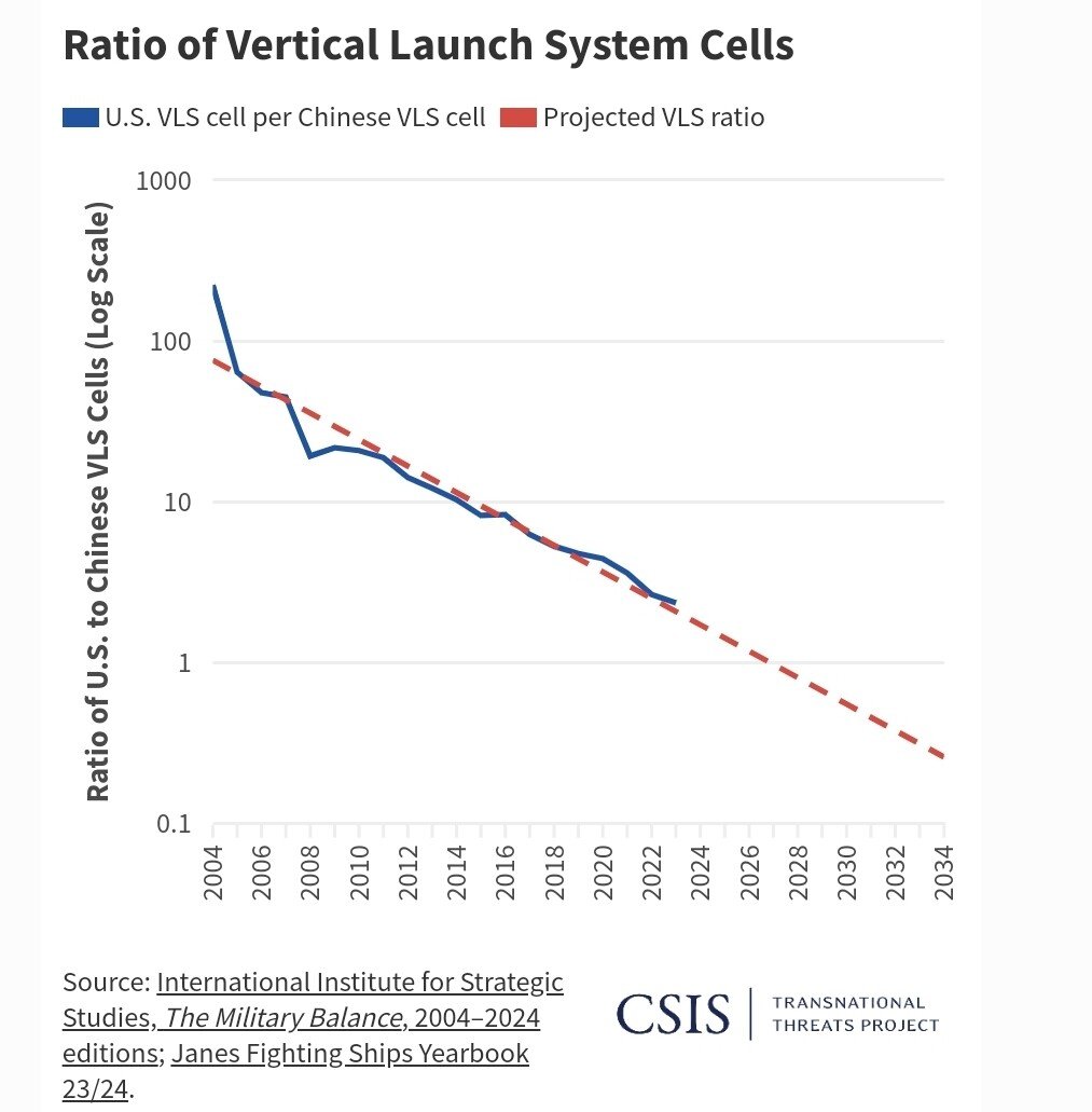 그러나 중국은 몇년내로 미국의 VLS 갯수를 따라잡으리라 예상되고 있다. 20년전인 2004년에 미국 해군은 중국 해군 대비 VLS갯수가 무려 222배였으나 지금은 2배 약간 넘는 수준에 불과하다.