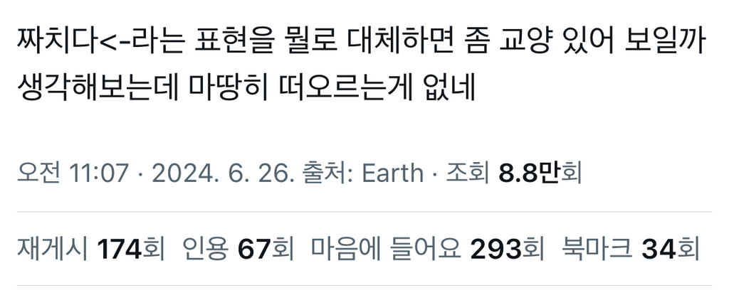 답댓글 작성자맛있는건전부내입으로와앙 작성시간 24.06.27 굳이 짜친다가 교양없어보이면 다른의미로 쪼들린다라고 쓰기도했음...짜친다 써오면서 교양없어보인다는거 첨알았네