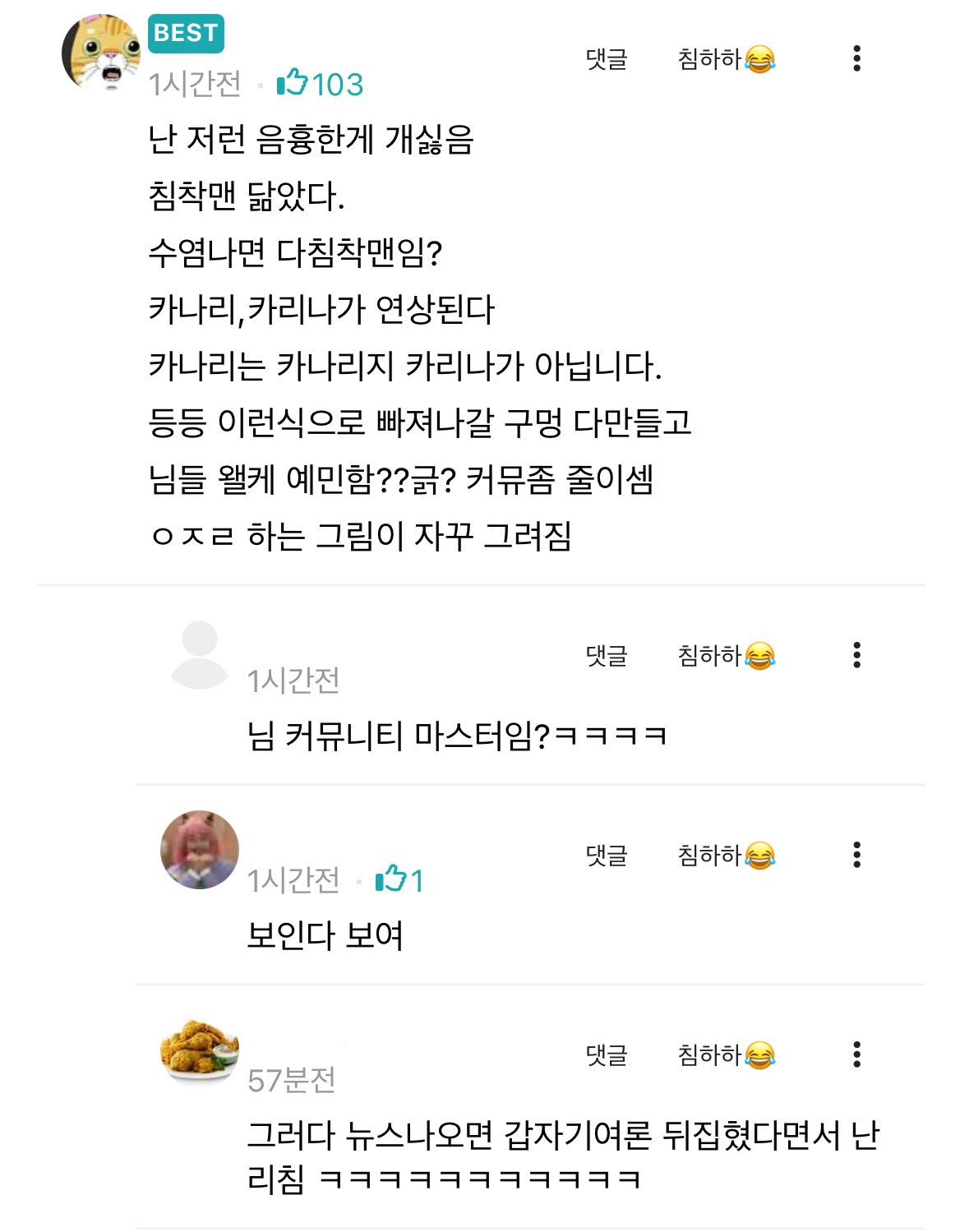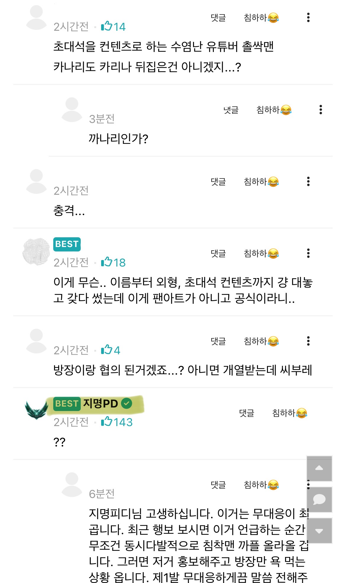 [흥미돋]하이브가 만든 촐싹맨 보고 댓글단 침착맨 방송 PD 작성자nero|작성시간24.06.28|조회수23,429 목록 댓글 40 글자크기 작게가 글자크기 크게가 출처: 여성시대 nero이름이랑 외형부터 누가봐도 침착맨인데얘네 뭐하냐..? (피디가 침하하에 댓글 단거보면 걍 지들 맘대로 베꼈나봄) 다음검색 현재 게시글 추가 기능 열기 북마크 공유하기 신고 센터로 신고 댓글 댓글 40 댓글쓰기 답글쓰기 댓글 리스트 작성자빠바바바나나나 | 작성시간 24.06.28 노이즈 마케팅이냐? 작성자작은올리브나무 | 작성시간 24.06.28 또 하이브야 작성자하루양갱 | 작성시간 24.06.28 얘넨 늘 이랬어 그동안 본문 예상댓처럼 빠져나왔던거임 작성자동해물과 죽방멸치 | 작성시간 24.06.28 진짜 추하다 작성자누눙눙눙 | 작성시간 24.06.28 카나리 ㅋㅋㅋㅋㅋㅋ 댓글 전체보기