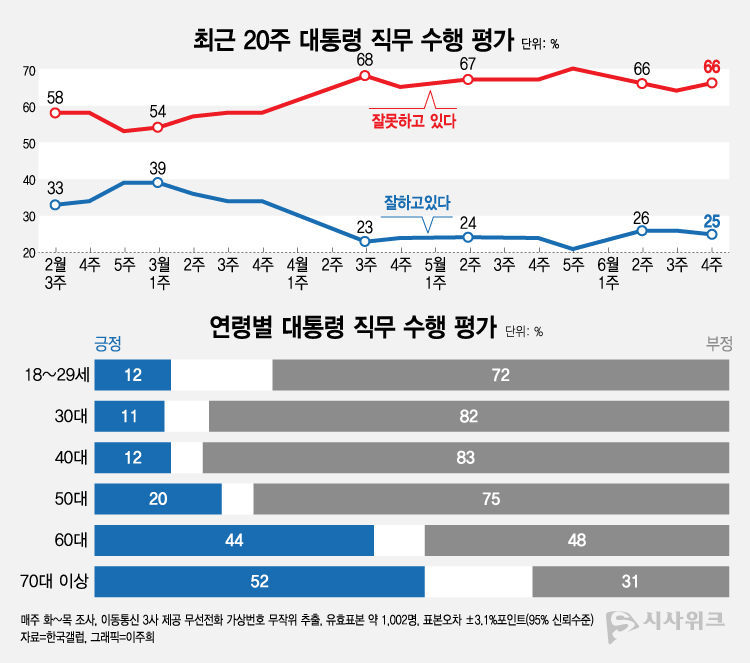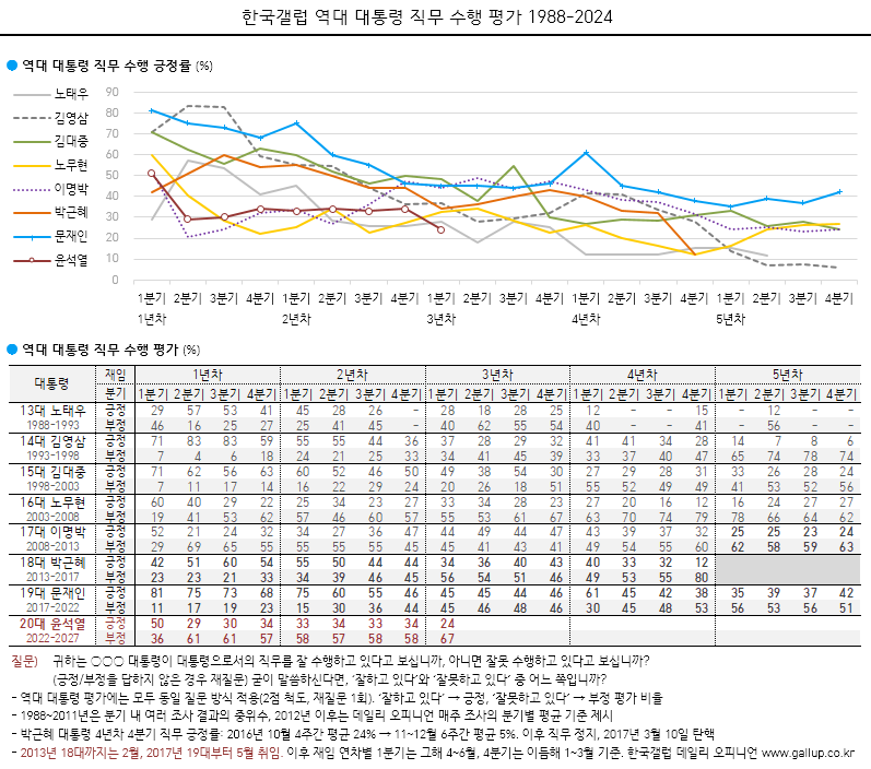 윤 대통령의 취임 3년 차 1분기(2024년 4~6월) 평균 직무수행 긍정평가는 24%였다. 이같은 평가는 전임 대통령들보다 낮은 편이다. 13대 노태우 28%, 14대 김영삼 37%, 15대 김대중 49%, 16대 노무현 33%, 17대 이명박 44%, 18대 박근혜 34%, 19대 문재인 45%를 각각 기록한 바 있다.