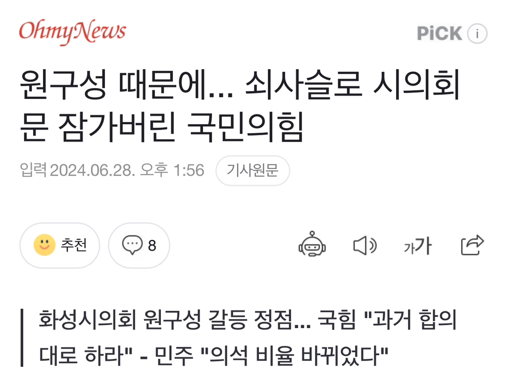 [여시뉴스데스크]원구성 때문에... 쇠사슬로 시의회 문 잠가버린 국민의힘 작성자소리앙|작성시간24.06.28|조회수887 목록 댓글 2 글자크기 작게가 글자크기 크게가 출처: https://naver.me/xxYyco0R원구성 때문에... 쇠사슬로 시의회 문 잠가버린 국민의힘▲ 국민의힘 화성시의회 의원은 오전 본회의가 열리지 못하게 본회의장 문을 걸어 잠갔다. ⓒ 화성시민신문 원구성으로 갈등을 빚던 화성시의회의 본회의장 입구가 쇠사슬로 묶여 잠기는 일이 n.news.naver.com전문출처 다음검색 현재 게시글 추가 기능 열기 북마크 공유하기 신고 센터로 신고 댓글 댓글 2 댓글쓰기 답글쓰기 댓글 리스트 작성자쪽바리짱꼴라잔류일본인전부소멸 | 작성시간 24.06.28 진짜 막나가는구나 논리와 지성 상식이 부족하니까 이제 걍 무식하게 늦게오고 문잠그고 언성 높이고... 진따 수준 떨어진다 작성자동네떵개 | 작성시간 24.06.28 진짜 무식해 저런새끼들이 국회의원이라니 댓글 전체보기