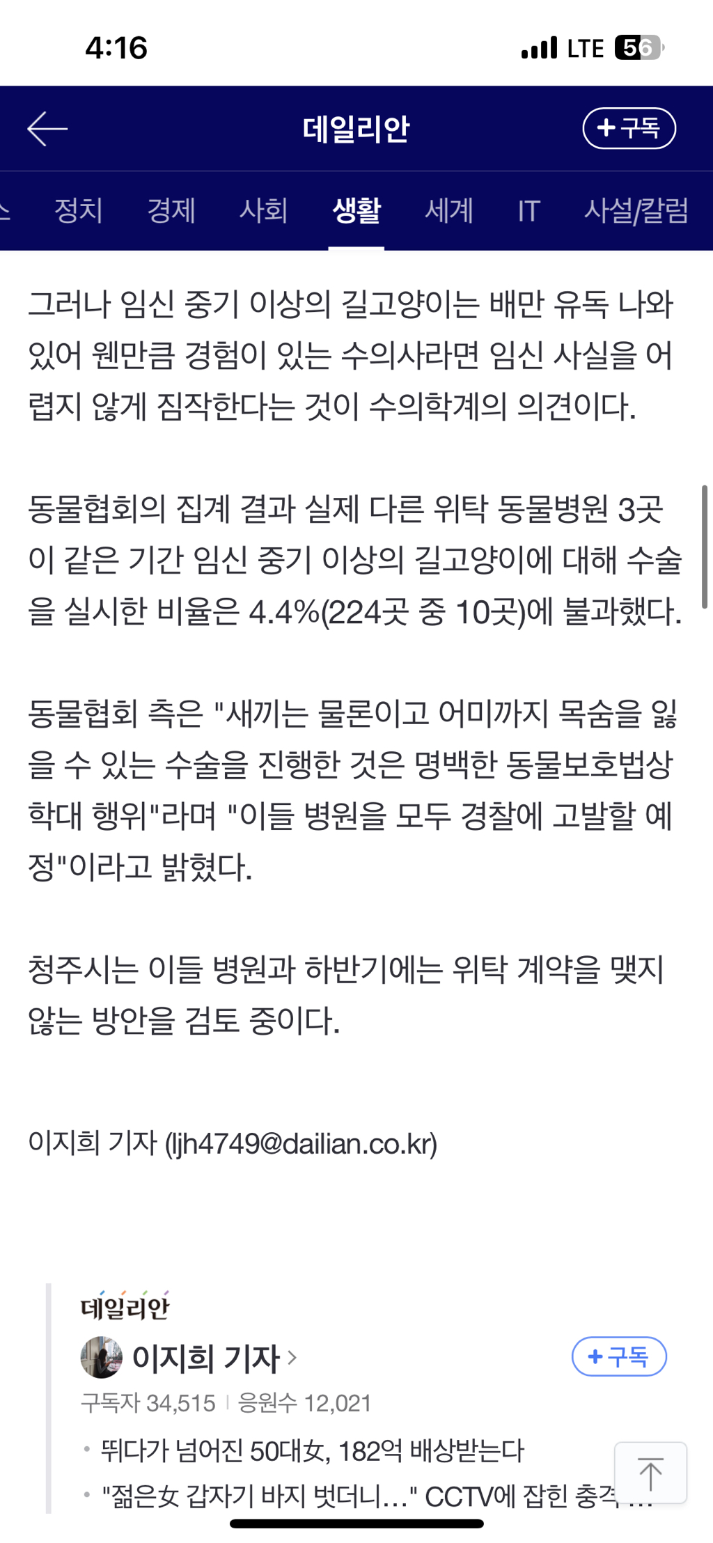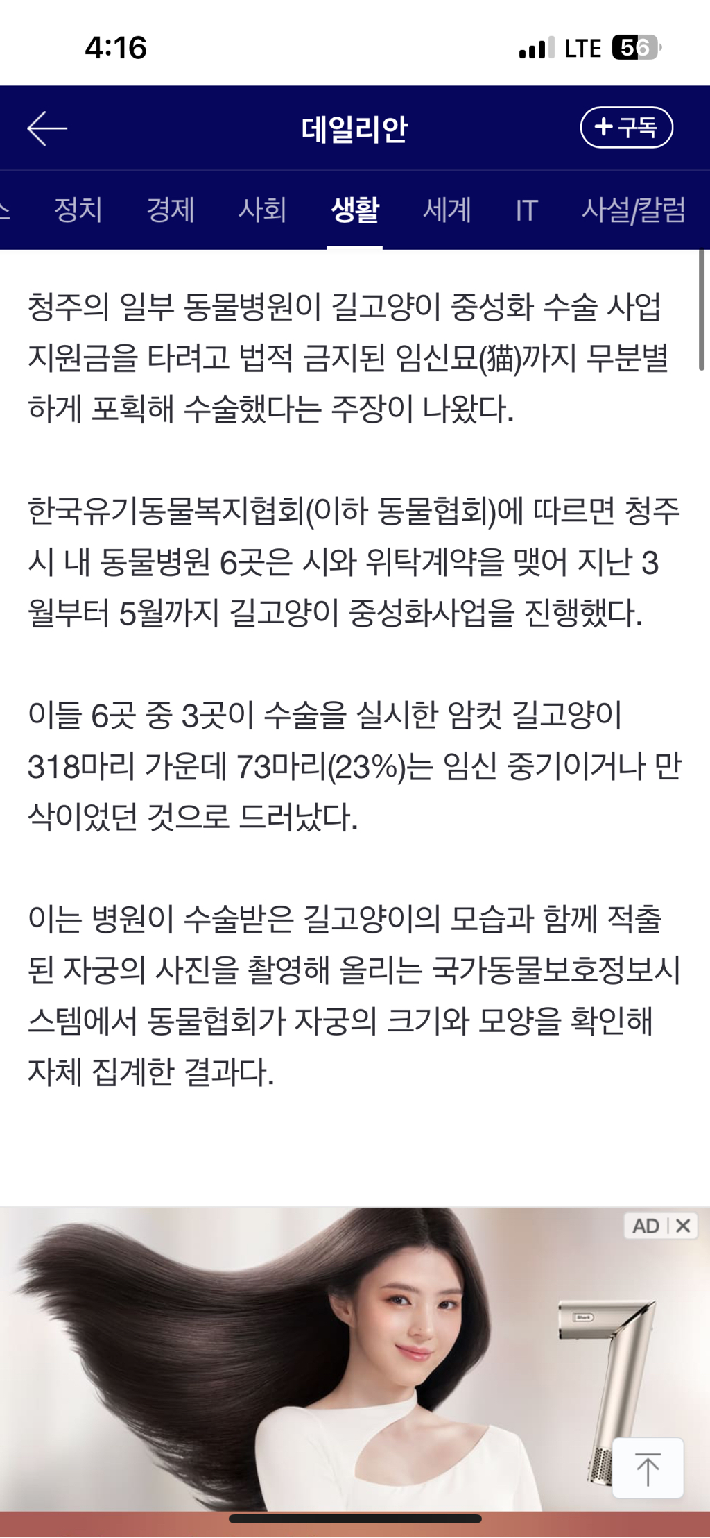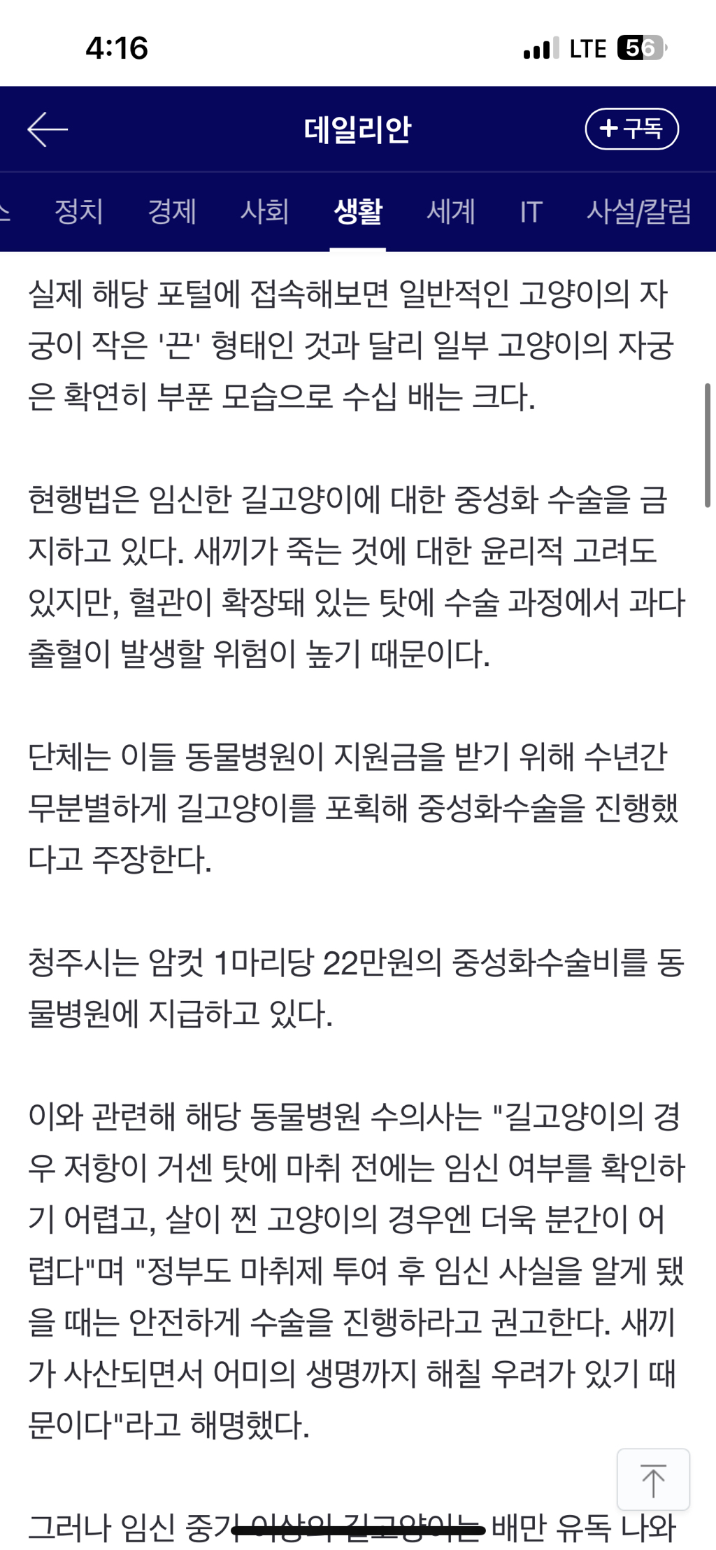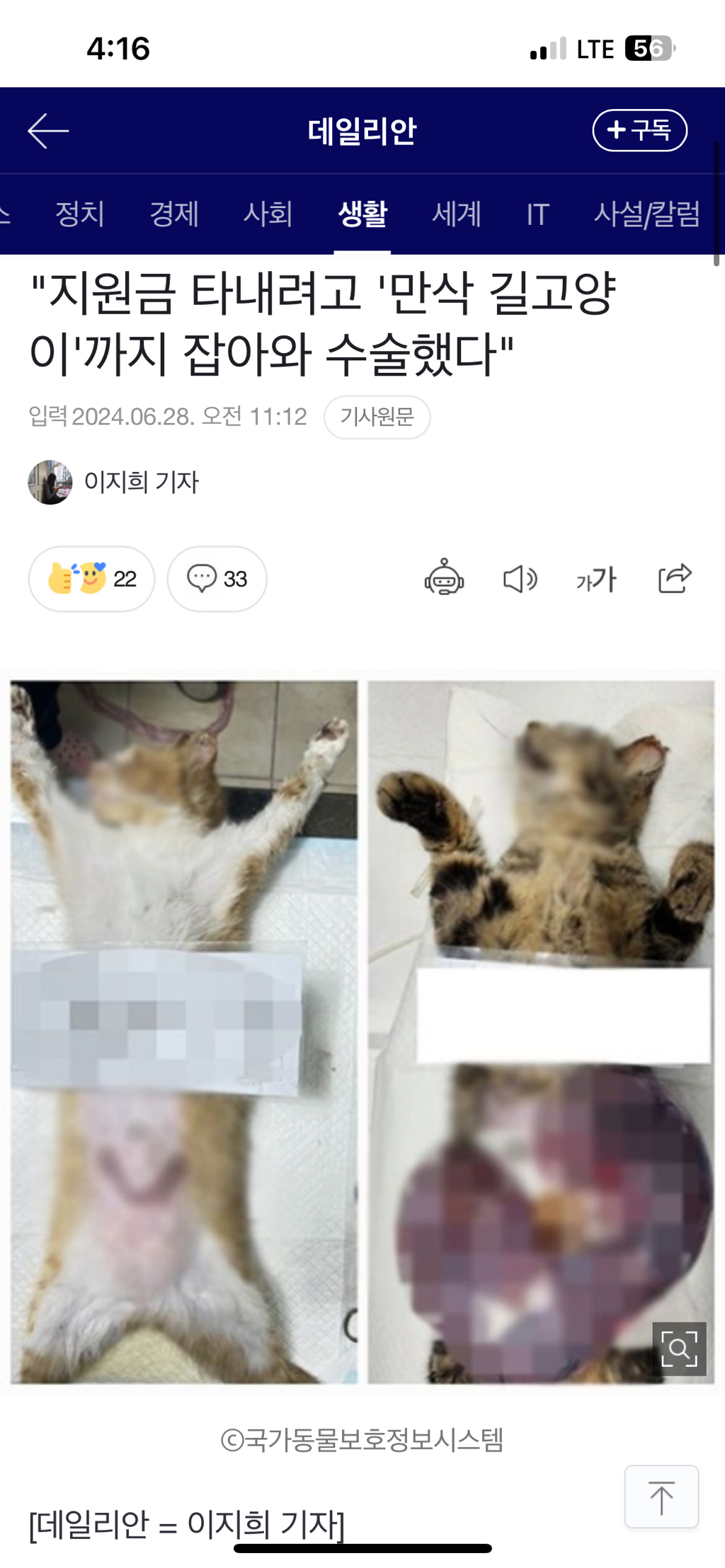 [여시뉴스데스크]"지원금 타내려고 '만삭 길고양이'까지 잡아와 수술했다" 작성자군밤킬러|작성시간24.06.28|조회수2,955 목록 댓글 17 글자크기 작게가 글자크기 크게가 출처: https://naver.me/GALKjjFU"지원금 타내려고 '만삭 길고양이'까지 잡아와 수술했다"청주의 일부 동물병원이 길고양이 중성화 수술 사업 지원금을 타려고 법적 금지된 임신묘(猫)까지 무분별하게 포획해 수술했다는 주장이 나왔다. 한국유기동물복지협회(이하 동물협회)에 따르n.news.naver.com하 진짜.. 다음검색 현재 게시글 추가 기능 열기 북마크 공유하기 신고 센터로 신고 댓글 댓글 17 댓글쓰기 답글쓰기 댓글 리스트 작성자바부투성이 | 작성시간 24.06.28 제발 길고양이들한테 그러지마…….. 작성자머리아퍄 | 작성시간 24.06.28 아이고.... 작성자올해는된다 | 작성시간 24.06.28 나도 인천에 의심가는 새끼 하나 있음ㅋㅋ 그 새끼 병원 주변에 4-5개월도 안 된 애기들 귀 잘린 채 있거든.. 내새끼도 그 병원 뒷 골목에서 데려옴 작성자덬볶희 | 작성시간 24.06.28 사람이냐 작성자쏘주한잔 | 작성시간 24.06.30 아진짜 인간이냐고.. 댓글 전체보기