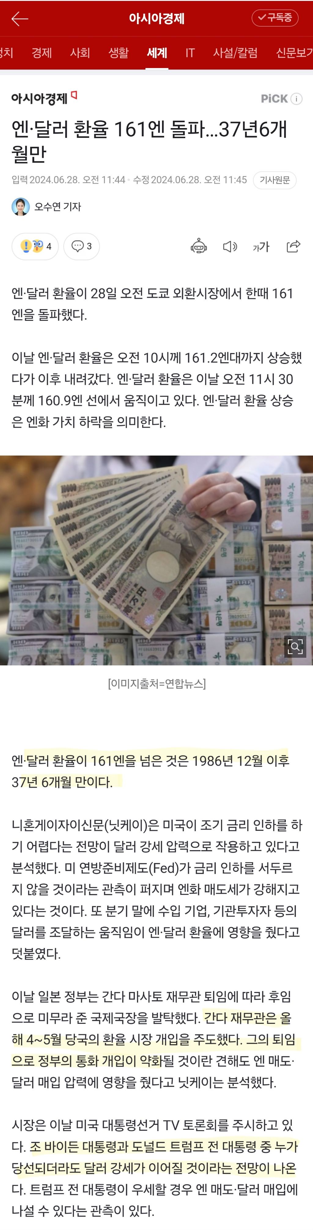 [여시뉴스데스크]엔·달러 환율 161엔 돌파…37년6개월만 작성자늘kongjwi가이겨|작성시간24.06.28|조회수5,278 목록 댓글 3 글자크기 작게가 글자크기 크게가 출처: https://naver.me/FxFQQv6P엔·달러 환율 161엔 돌파…37년6개월만엔·달러 환율이 28일 오전 도쿄 외환시장에서 한때 161엔을 돌파했다. 이날 엔·달러 환율은 오전 10시께 161.2엔대까지 상승했다가 이후 내려갔다. 엔·달러 환율은 이날 오전 11시 30분께 160.9엔 선n.news.naver.com 다음검색 현재 게시글 추가 기능 열기 북마크 공유하기 신고 센터로 신고 댓글 댓글 3 댓글쓰기 답글쓰기 댓글 리스트 작성자양마겟돈 | 작성시간 24.06.28 170까지도 보던디.. ㅈ됨... 긴축통화도 와르르인데 원화따리는 저 세상 가는거지 ㅠㅠ 작성자뽕뽕빵 | 작성시간 24.06.28 대박이네 작성자PEACEMINUSONE | 작성시간 24.06.28 중복https://m.cafe.daum.net/subdued20club/ReHf/4939901?svc=cafeapp 댓글 전체보기