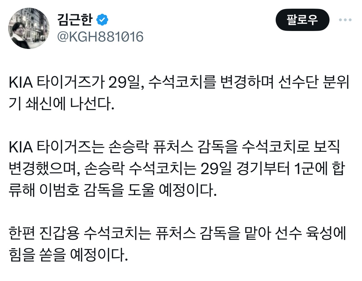 [흥미돋][KBO] 기아 분위기 쇄신위해 수석코치 변경 작성자냐웅잉|작성시간24.06.29|조회수6,722 목록 댓글 46 글자크기 작게가 글자크기 크게가 출처: 여성시대 냐웅잉헐 손승락 1군르로 올라와???승락스쿨은 어째고..????? 다음검색 현재 게시글 추가 기능 열기 북마크 공유하기 신고 센터로 신고 댓글 댓글 46 댓글쓰기 답글쓰기 댓글 리스트 작성자크룽지 크로와상 | 작성시간 24.06.29 ㅅㅂ 승락스쿨 왜 건드려 작성자ㄱ1 아타이거즈 | 작성시간 24.06.29 시발 이범호가 문제라고 작성자고슴도치의 감격 | 작성시간 24.06.29 감독만 나가면 됨 작성자튀기고x10튀겨질통장 | 작성시간 24.06.29 2군도 승락없어서 망하면 기아 더 망하겠는데?... 미래를 팔아 현재 틀어막는 돌빼서 돌넣기 하네 ㅋㅋㅋㅋㅋㅋㅋ 작성자타이거즈 김도영 | 작성시간 24.06.29 머???? 손승락을 왜 데려와 퓨쳐스는 어쩌라고... 댓글 전체보기