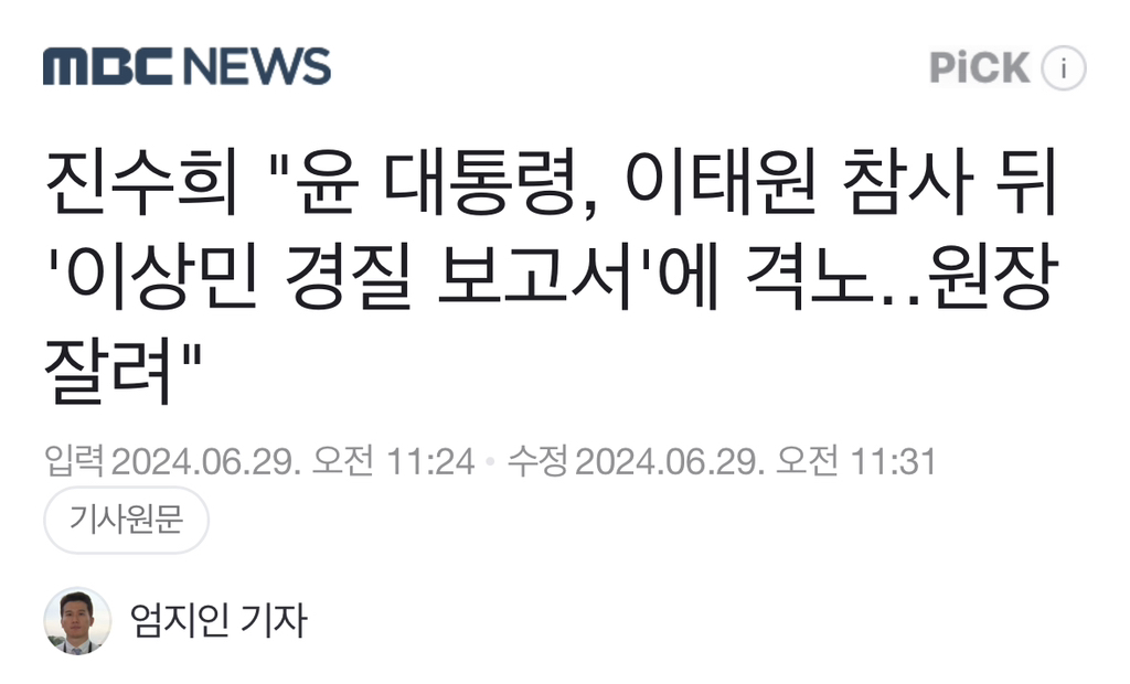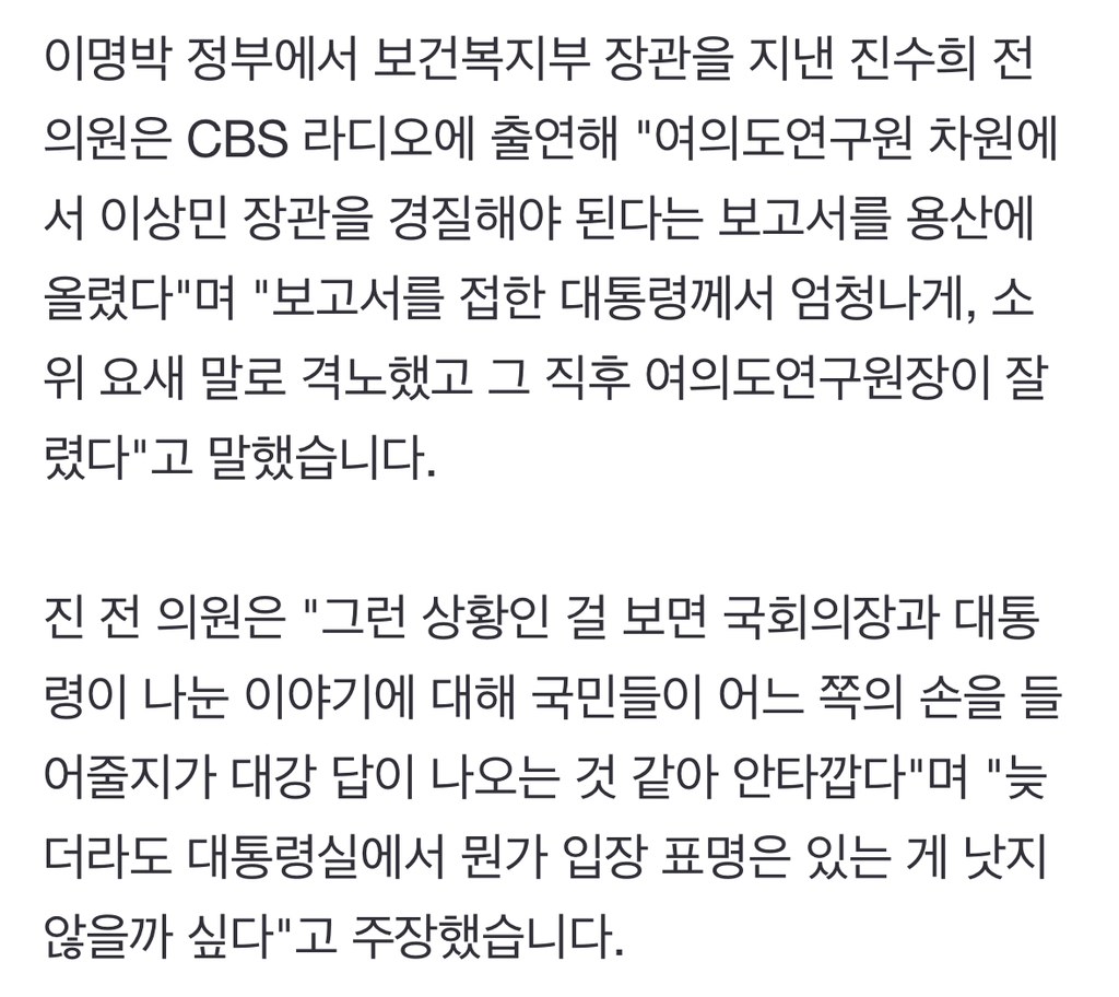 [여시뉴스데스크]진수희 "윤 대통령, 이태원 참사 뒤 '이상민 경질 보고서'에 격노‥원장 잘려" 작성자소리앙|작성시간24.06.29|조회수793 목록 댓글 1 글자크기 작게가 글자크기 크게가 출처: https://naver.me/5eUEwzIZ진수희 "윤 대통령, 이태원 참사 뒤 '이상민 경질 보고서'에 격노‥원장 잘려"윤석열 대통령이 10·29 이태원 참사에 대해 "'조작된 사건일 가능성도 배제할 수 없다'고 말했다"는 김진표 전 국회의장의 회고록에 이어 이번엔 윤 대통령이 당시 '이상민 행정안전부 장관을 경n.news.naver.com전문출처 다음검색 현재 게시글 추가 기능 열기 북마크 공유하기 신고 센터로 신고 댓글 댓글 1 댓글쓰기 답글쓰기 댓글 리스트 작성자충분히 잘하고 있어 | 작성시간 24.06.29 집에서는 명신이한테 빌빌 기면서 맨날 다른 사람들한테 쳐 격노하고 지랄이야 진짜저정도로 무능력하고 사리분별 안되는 새끼를 대체 누가 뽑아놨냐고 댓글 전체보기