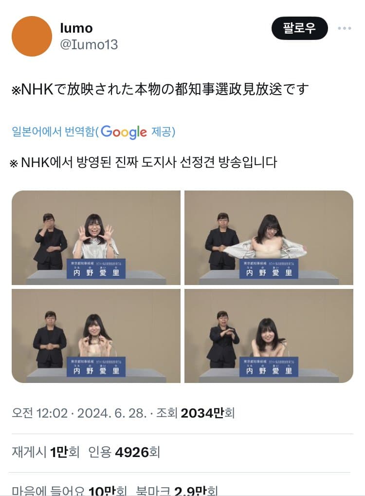 [기타]충격적인 일본 도지사 선거 방송 작성자guguru_ww|작성시간24.06.29|조회수11,720 목록 댓글 34 글자크기 작게가 글자크기 크게가 출처: x 캡처 계정 ???????????????????????????? 다음검색 현재 게시글 추가 기능 열기 북마크 공유하기 신고 센터로 신고 댓글 댓글 34 댓글쓰기 답글쓰기 댓글 리스트 작성자Getting Better | 작성시간 24.06.29 나가면 돈줘..? 유튜브 홍보하려는거임? 답댓글 작성자Getting Better | 작성시간 24.06.29 …컨셉이겎지? 어떻게 이게 진짜임? 이미지 확대 작성자수금관리 | 작성시간 24.06.29 ??????? 작성자욥욥 | 작성시간 24.06.29 왜저래??? 개판이네 완전 작성자모모사랑단 | 작성시간 24.07.01 와.. 저기는 1호선 안가도 되네.... 나라자체가 1호선이야? 댓글 전체보기
