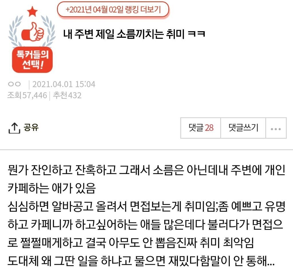 작성자훌라후프루피 작성시간 24.06.29 난 진짜일수도 있다고 봤는데.. 그냥 예쁜 카페라서가 아니라 ㅋㅋ 어차피 안뽑을 거니까 조건 좋게 적어놓고 사람들 면접보러 오면 뭐 20대 사회경험 없음 + 당근 일해서 돈벌고 싶어서 면접보러 온거니까 잘보이고 싶은 마음 합쳐져서 곤란한 질문 하고 고압적으로 굴면 쩔쩔 매는거 있을법 하다고 봄 진짜 못돼먹었네