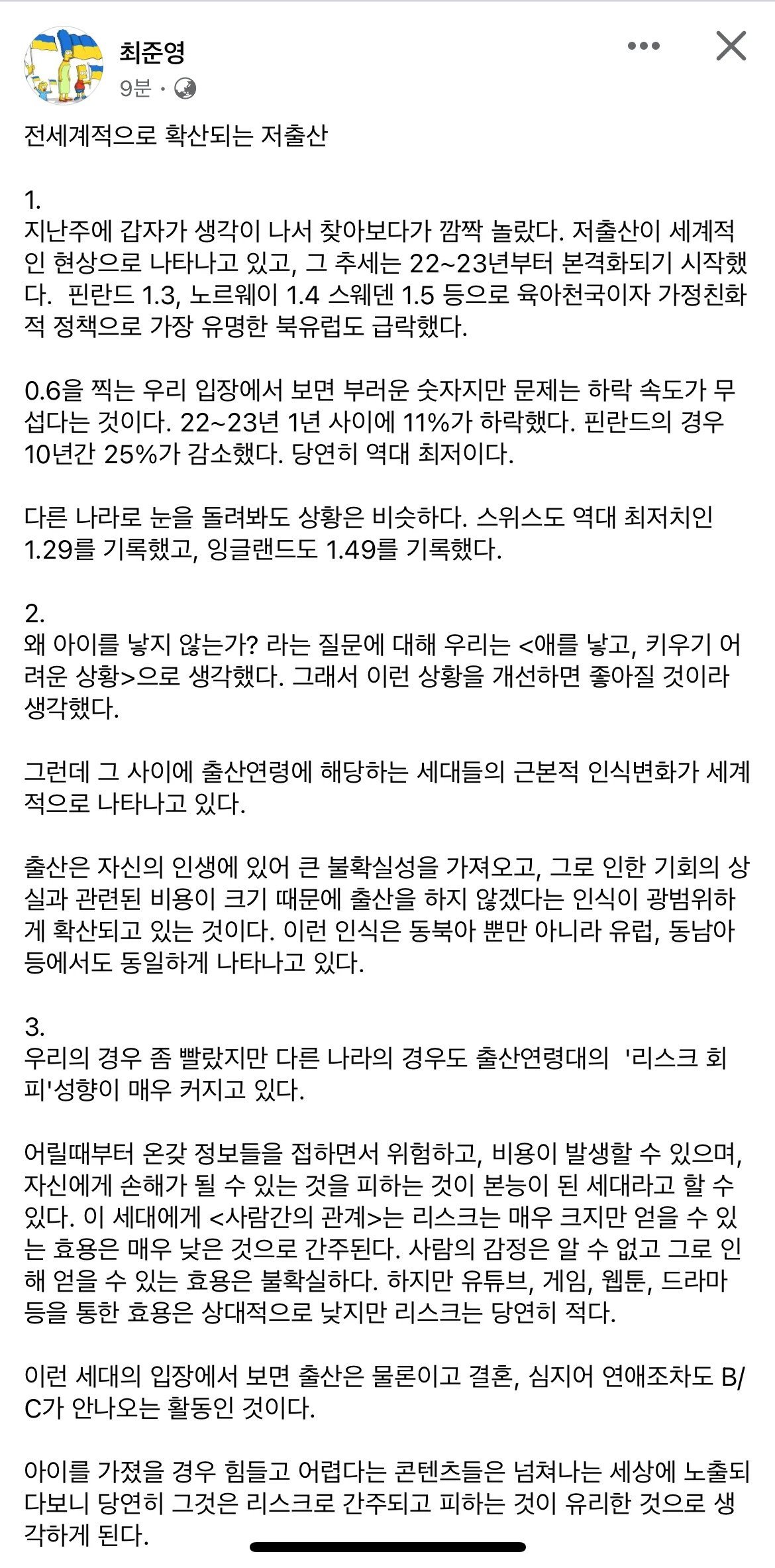 작성자먀먀묘뮤 작성시간 24.06.29 자식키울때 돈과 노동력을 쏟아부은 댓가가 없음 옛날에는 자식이 부모부양했지만 지금은 안하잖아 부모의 노후자금을 자식한테 투자한건데 마이너스투자이지 백세시대에 돈없으면 노인되서 어떻게 살아감 사람들이 괜히 안낳는게 아님