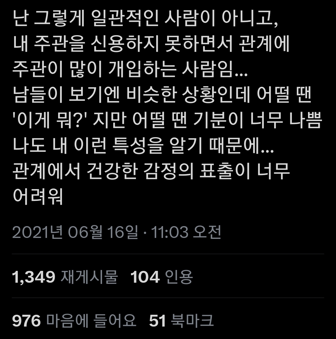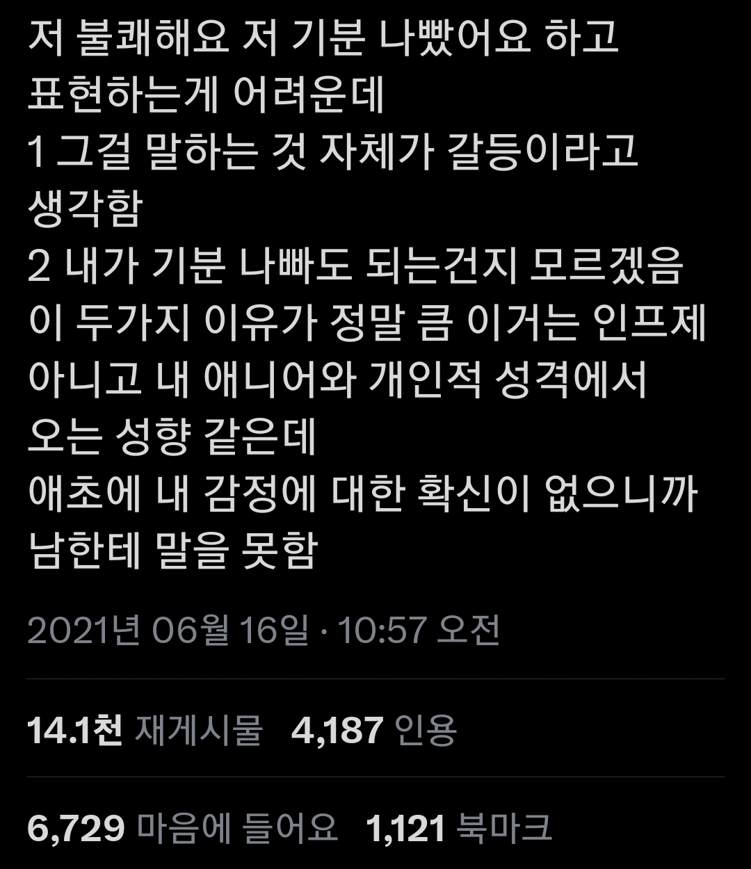 작성자나자신을사랑해주기 작성시간 24.06.30 말 못하고 끙끙 앓는데 말을 못하겠어ㅋㅋㅋ 그리고 또 내 감정 파악하는게 느려서 말할 타이밍 지나기도 하고