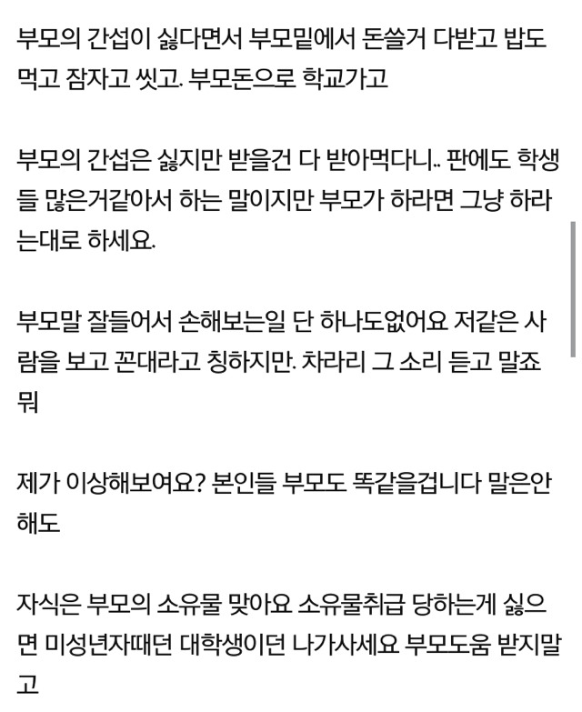 [스크랩] [기타][네이트판]자식들이 머리가 커지면 이런말을 해요 작성자나는야꼬마박사|작성시간24.06.30|조회수21,580 목록 댓글 75 글자크기 작게가 글자크기 크게가 다음검색 스크랩 원문 : 비공개카페 현재 게시글 추가 기능 열기 북마크 공유하기 신고 센터로 신고 댓글 댓글 75 댓글쓰기 답글쓰기 댓글 리스트 작성자씨봘 | 작성시간 24.06.30 미쳤나ㅡㅡ와 속이 부글거려. 작성자가루시파 | 작성시간 24.06.30 낳아놨으면 찍소리 말고 키워놔라 말이 많네 작성자연금복권 720 | 작성시간 24.06.30 뭔 소유물이야 장난하나 작성자15746 | 작성시간 24.07.01 낳지를 말아야지 작성자롤롤로로롤 | 작성시간 24.07.01 그럼 노인 돼서 애들이 부양해주면 부모가 애들 소유인건가? 소유물 되기 싫으면 굶어보세요~ 하면 되는거임? 댓글 전체보기