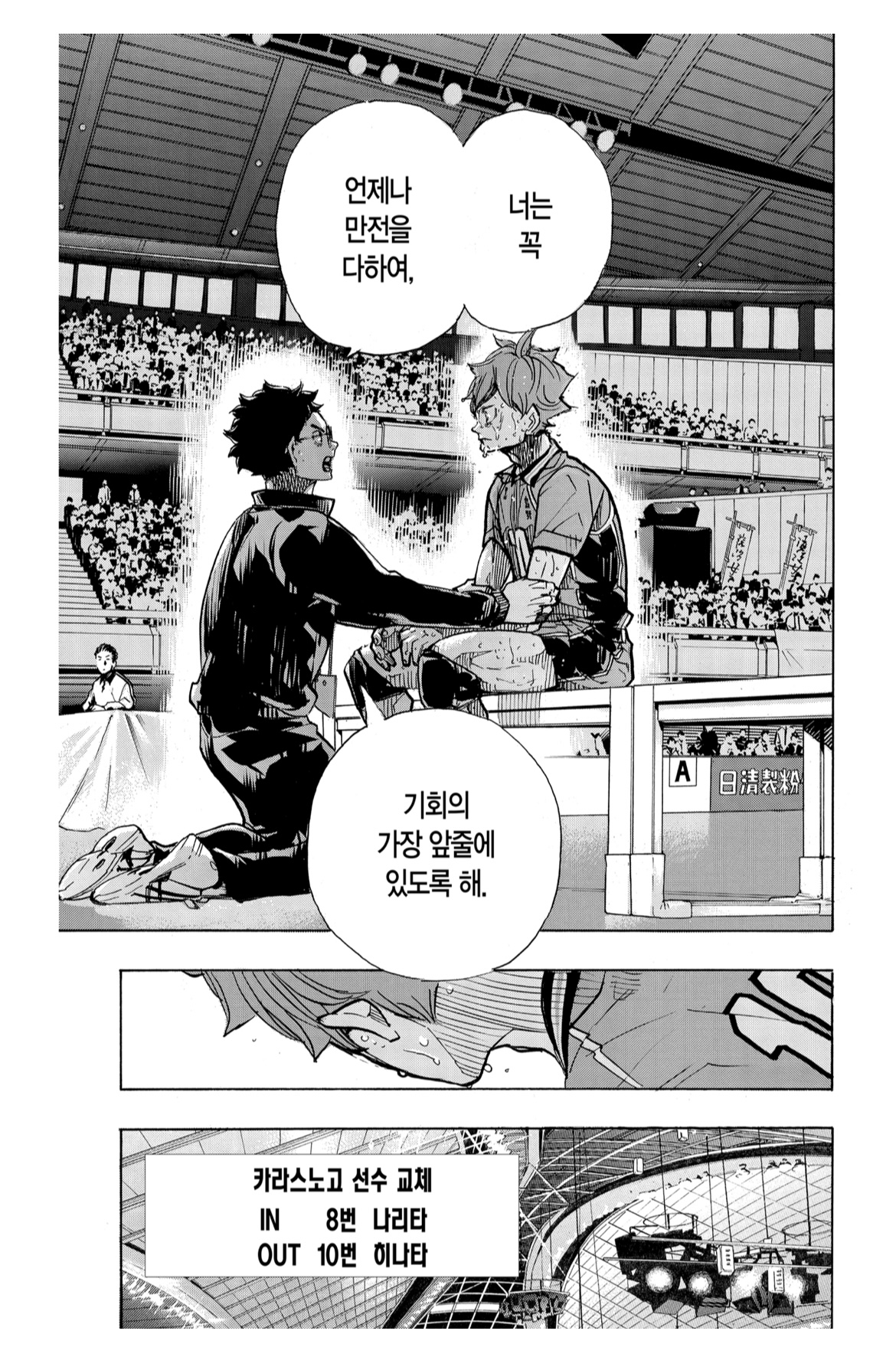 상황설명: 카모메다이와 카라스노가 전국대회 준준결승을 치루던 도중 주인공 히나타가 발열이 심해져 퇴장 당하기 전 카라스노의 감독 타케다 선생이 히나타에게 하는 조언