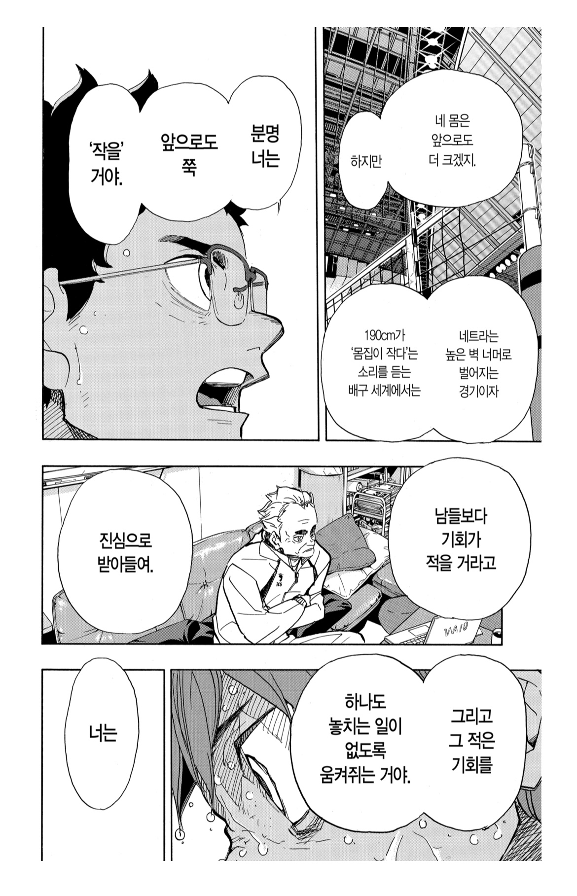 하지만 네트라는 높은 벽 너머로 벌어지는 경기이자 190cm가 '몸집이 작다' 는 소리를 듣는 배구 세계에서는 분명 너는 앞으로도 쭉 '작을'거야