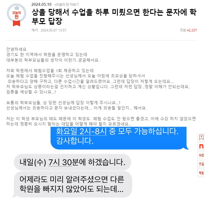 [기타]상을 당해서 수업을 하루 미뤘으면 한다는 문자에 학부모 답장 작성자민트쵸파|작성시간24.07.01|조회수21,923 목록 댓글 69 글자크기 작게가 글자크기 크게가 출처: https://pann.nate.com/talk/372517816상을 당해서 수업을 하루 미뤘으면 한다는 문자에 학부모 답장 | 네이트 판회사생활 : 안녕하세요 경기도 한 지역에서 학원을 운영하고 있는데 대부분의 학부모님들의 생각이 이런가..궁금해서요. 저희 학원에서 체험수업을 1회 제공하고 있는데 오늘 체험 수업을 진행pann.nate.com 다음검색 현재 게시글 추가 기능 열기 북마크 공유하기 신고 센터로 신고 댓글 댓글 69 댓글쓰기 답글쓰기 댓글 리스트 답댓글 작성자그러면서성장하는거라생각해 | 작성시간 24.07.01 말하는 디자인 좀 봐 그건 별개고? 도랐나 작성자냥르장머리 | 작성시간 24.07.01 조모상이란 단어뜻을 모르는거 아녀? 작성자제스프리키위로쉽고즐겁게 | 작성시간 24.07.02 한심하다 진짜 한심해 작성자퍼플콜라 | 작성시간 24.07.03 와 진짜 정내미 떨어진다... 작성자서창업 | 작성시간 24.07.06 애새끼가 어찌 자랄지 보이노.. 댓글 전체보기