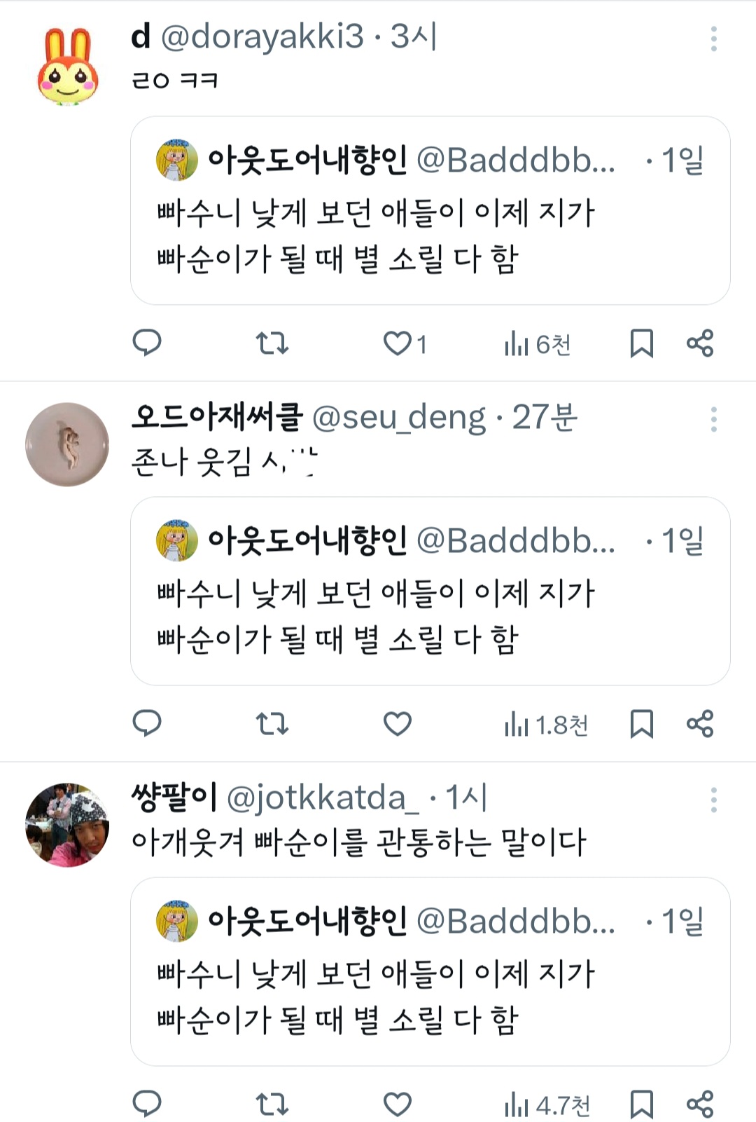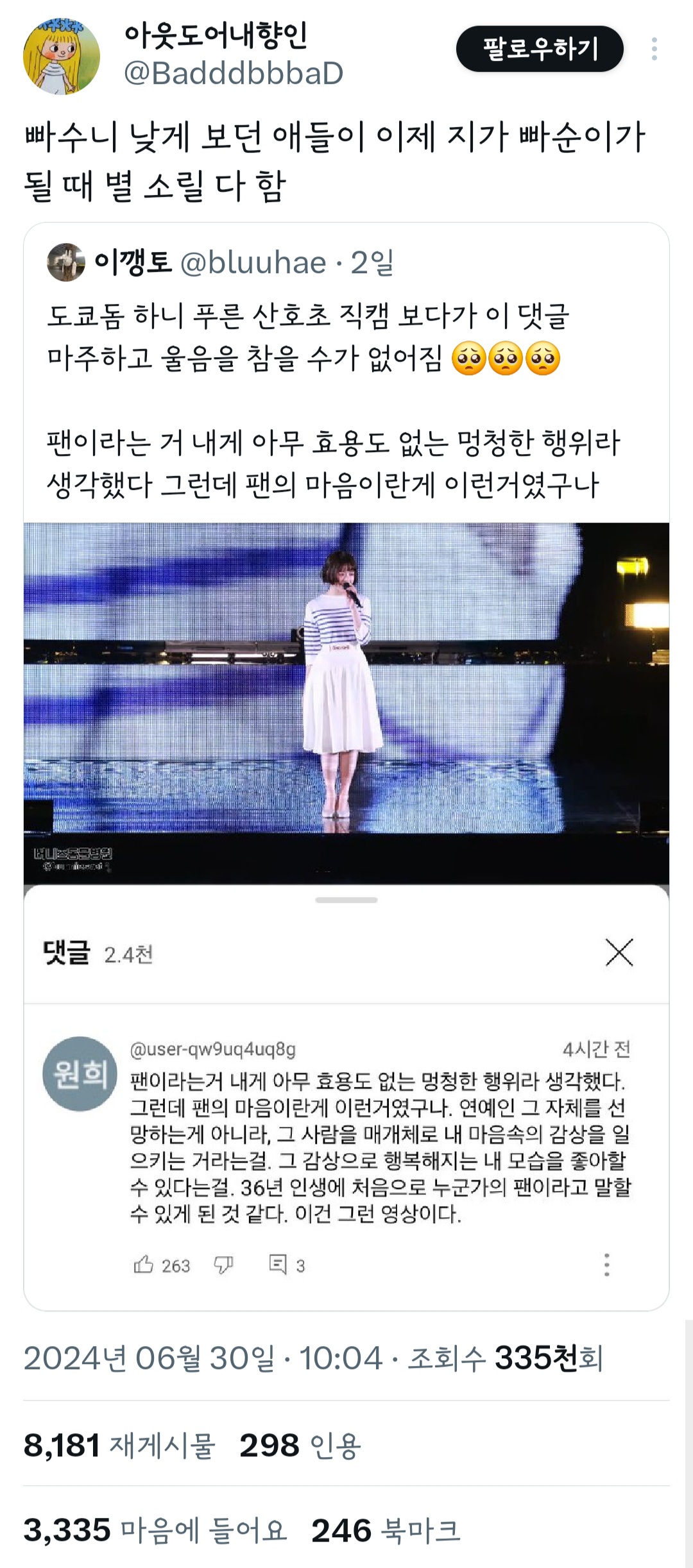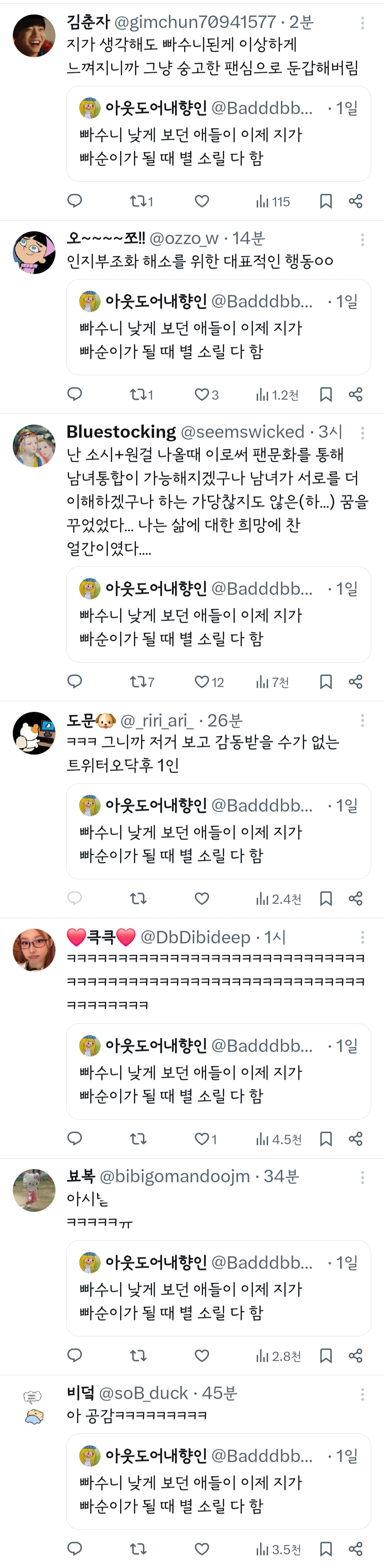 작성자오랫동안나를아는슬픈표정을하고 작성시간 24.07.01 나 트위터 안해서그러는뎈ㅋㅋ 저렇게 대놓고 모르는 사람한테 욕하면 저 사람이 화 안내? 알람 안가?