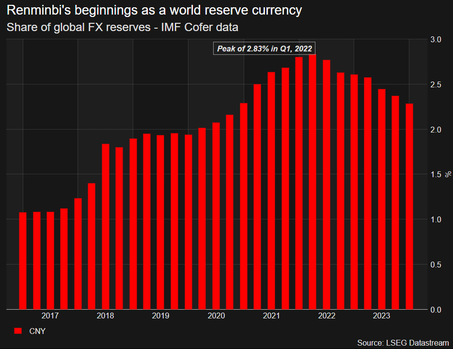 중국은 위안화가 보다 범세계적으로 쓰이게끔 할려고 노력은 하고 있으나 2022년 위안화 비중 2.8% 에서 최근 2.2% 로 되레 낮아졌음.