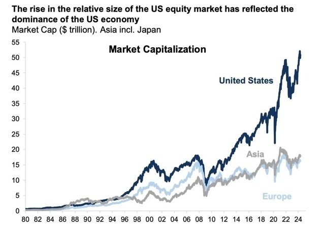 [ 1980년도부터 2024년도까지 미국 vs 아시아 vs 유럽 주식시장 규모 변동 ]