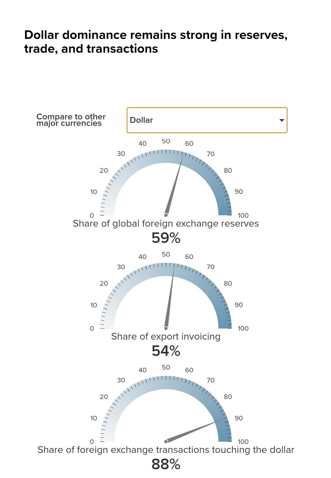 중장기적 전망은 몰라도 최소 근미래에는 달러가 여전히 지배적인 통화로 군림할것이라 보고 있음. 현재 세계에서 달러의 지배적 입지는 미국이 세계 경제에서 차지하는 비중을 훨씬 초과중임.