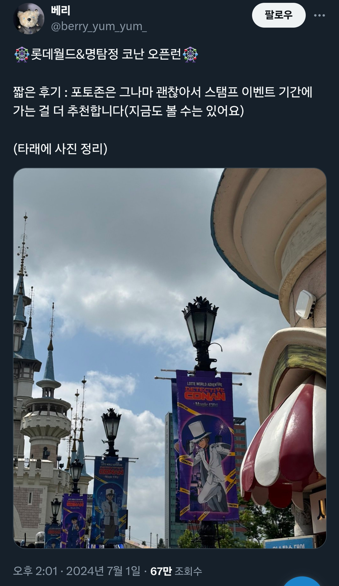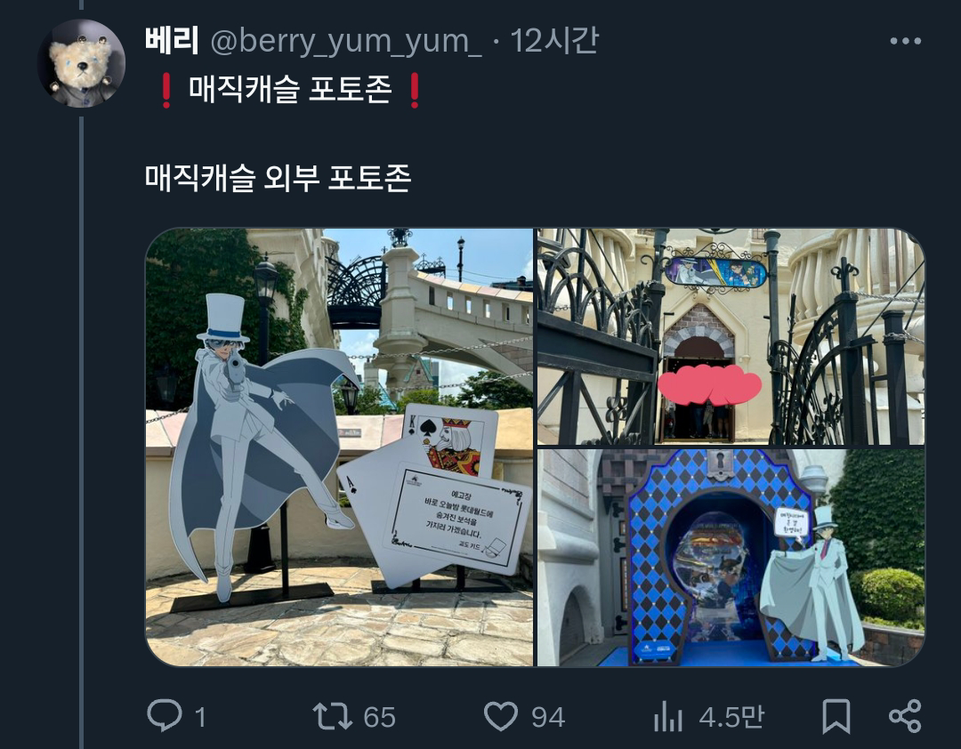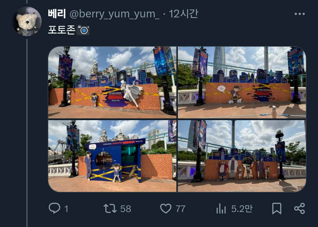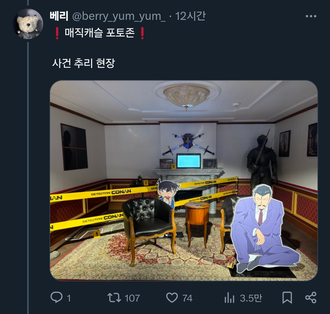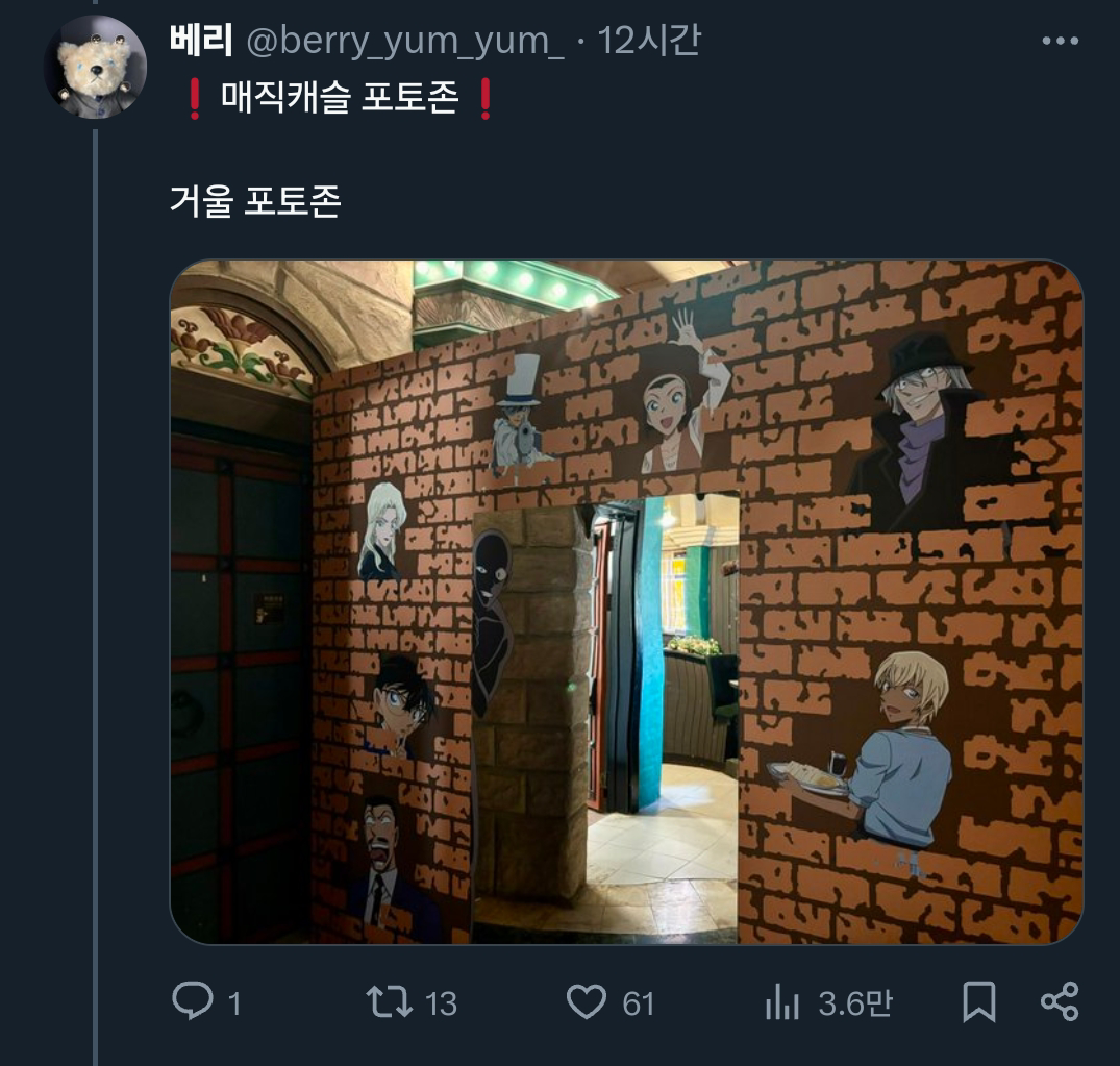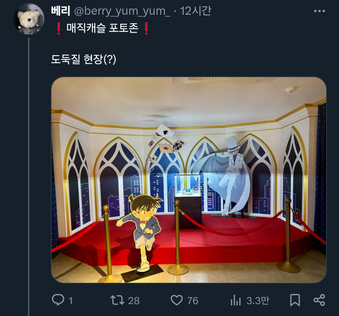 [기타]어느 트위터리안의 롯데월드X명탐정 코난 콜라보 후기.x 작성자폰서트|작성시간24.07.02|조회수34,084 목록 댓글 18 글자크기 작게가 글자크기 크게가 출처: 여성시대 (폰서트)https://x.com/berry_yum_yum_/status/1807640709639573542X의 베리님(@berry_yum_yum_)🎡롯데월드&명탐정 코난 오픈런🎡 짧은 후기 : 포토존은 그나마 괜찮아서 스탬프 이벤트 기간에 가는 걸 더 추천합니다(지금도 볼 수는 있어요) (타래에 사진 정리)x.com 다음검색 현재 게시글 추가 기능 열기 북마크 공유하기 신고 센터로 신고 댓글 댓글 18 댓글쓰기 답글쓰기 댓글 리스트 답댓글 작성자COFFEE BREAK | 작성시간 24.07.02 ㅋㅋㅋㅋㅋㅋㅋㅋㅋㅋㅋㅋㅋ 작성자닉네임입력웅앵웅 | 작성시간 24.07.02 살인사건 일어날거같아요ㄷㄷㄷㄷㄷ 작성자소형준 | 작성시간 24.07.02 뒤졋다 작성자COFFEE BREAK | 작성시간 24.07.02 후렌치 레볼루샨 타면 진주목걸이로 누가 살인하는거 아니겠죠 ㄷ ㄷ 작성자바나헤임 | 작성시간 24.07.02 완전 본격적이다 댓글 전체보기