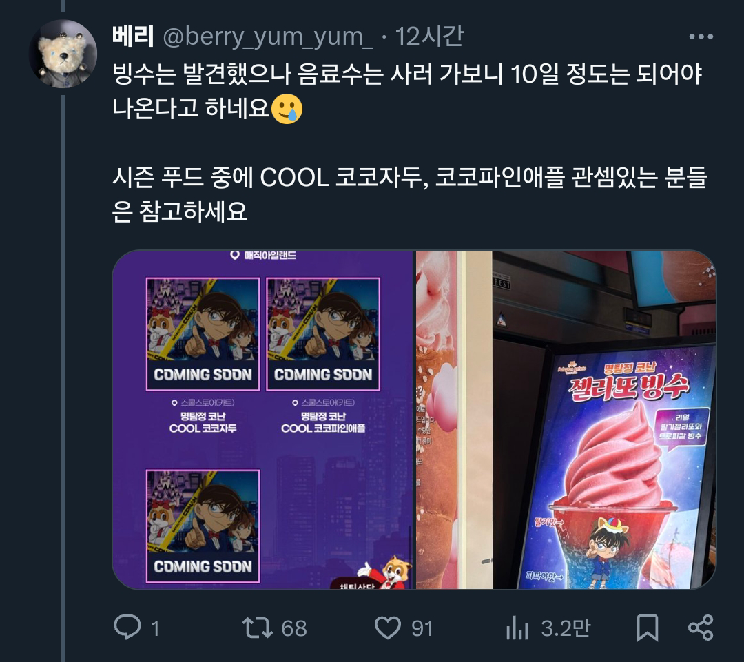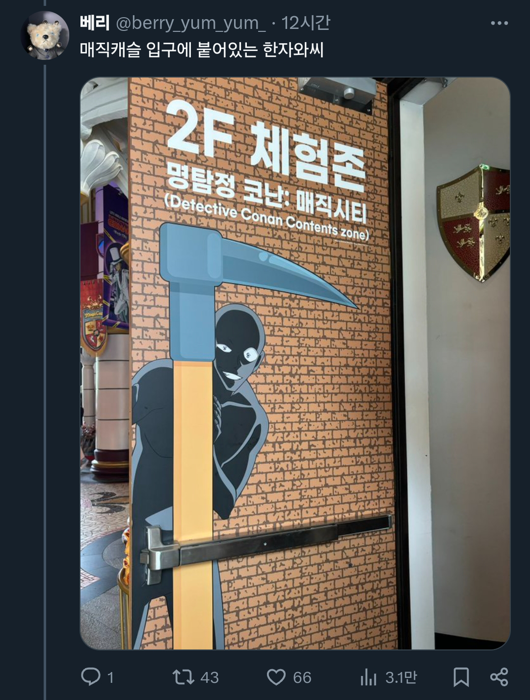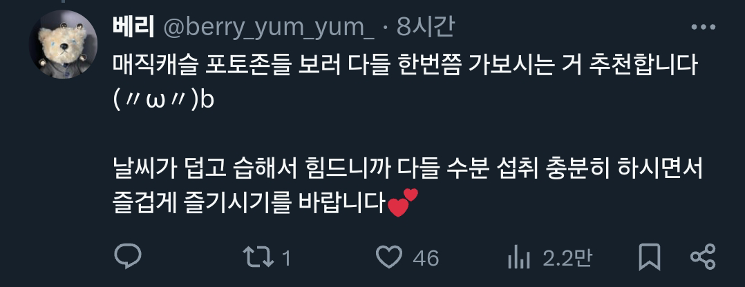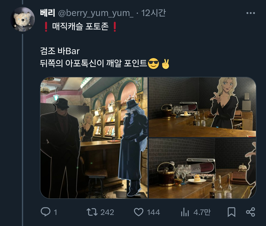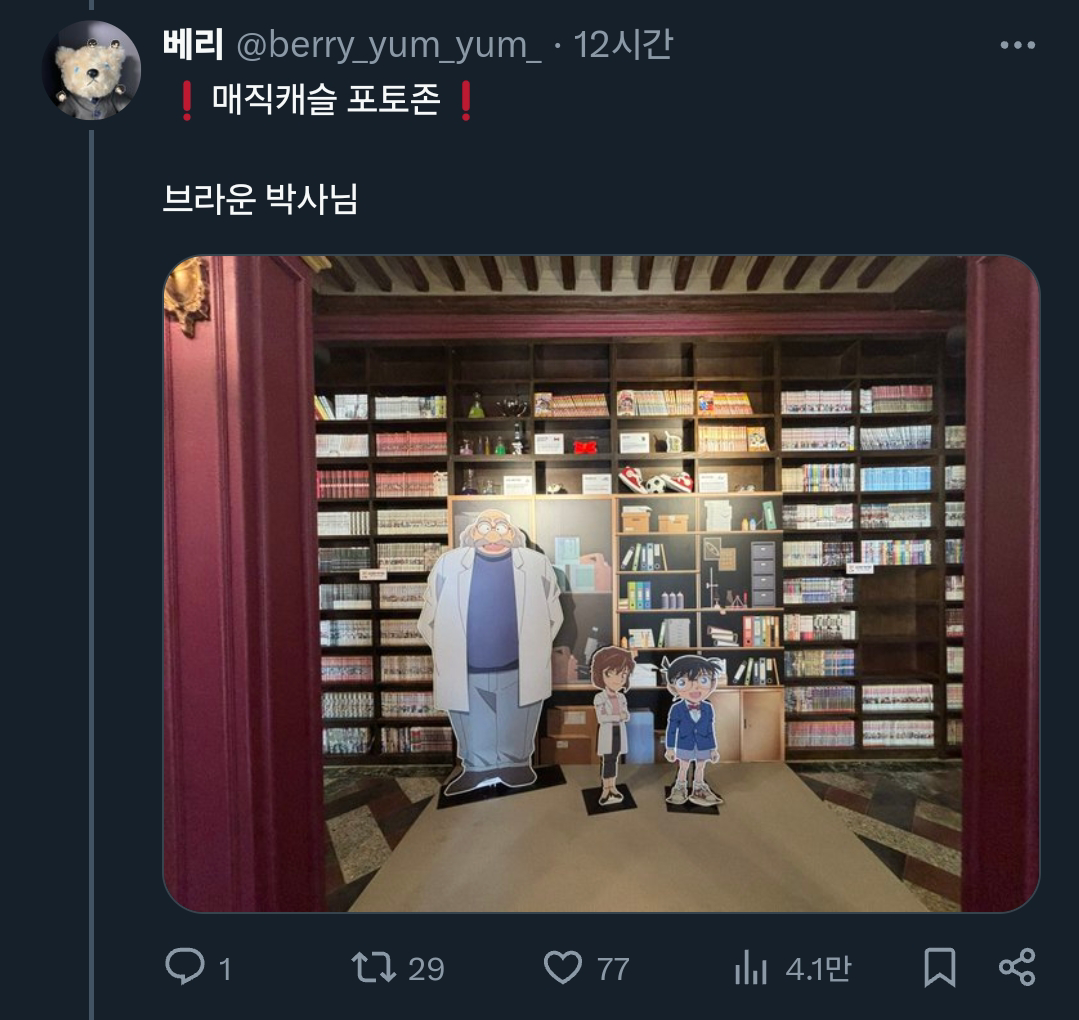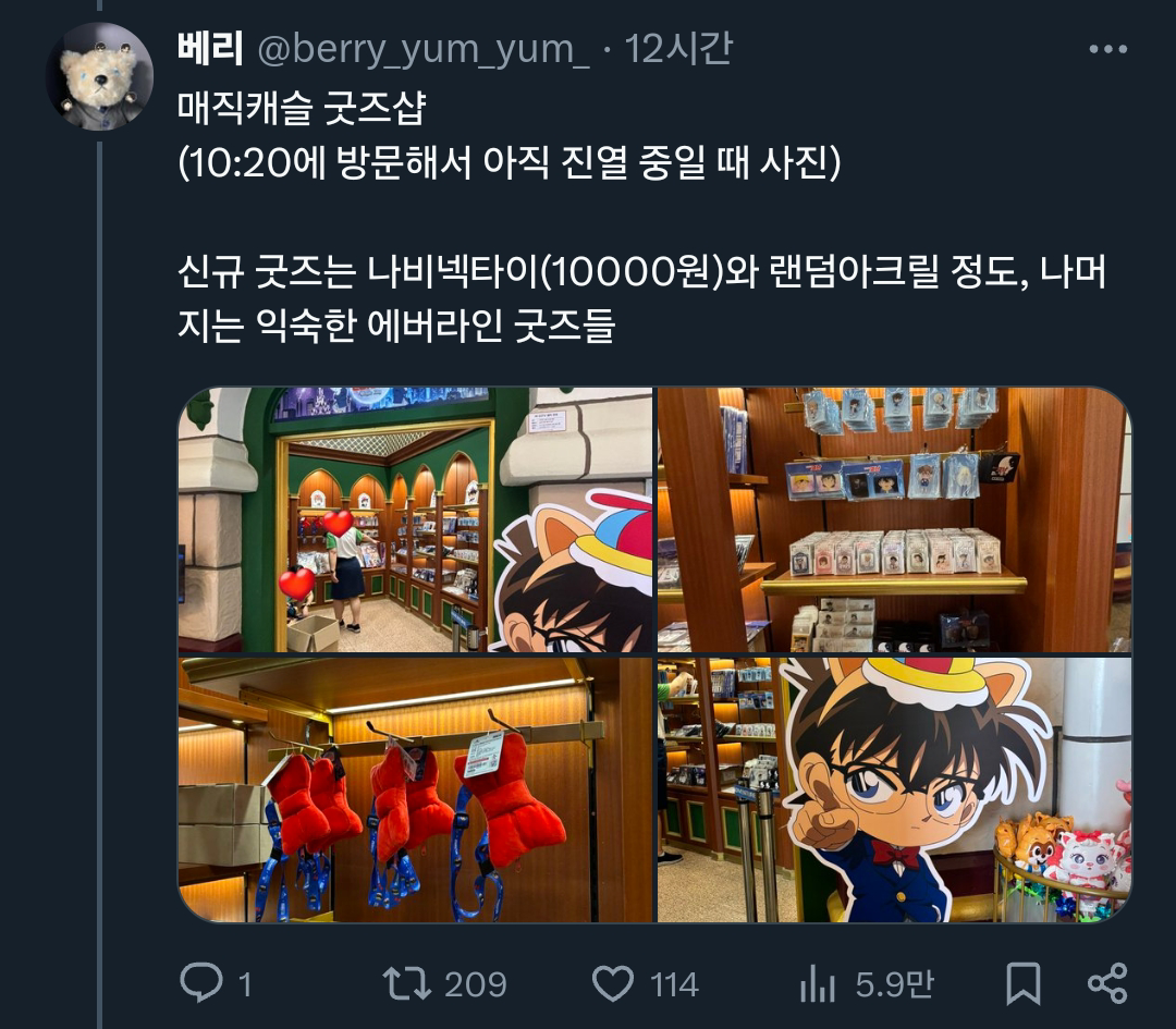 [기타]어느 트위터리안의 롯데월드X명탐정 코난 콜라보 후기.x 작성자폰서트|작성시간24.07.02|조회수34,084 목록 댓글 18 글자크기 작게가 글자크기 크게가 출처: 여성시대 (폰서트)https://x.com/berry_yum_yum_/status/1807640709639573542X의 베리님(@berry_yum_yum_)🎡롯데월드&명탐정 코난 오픈런🎡 짧은 후기 : 포토존은 그나마 괜찮아서 스탬프 이벤트 기간에 가는 걸 더 추천합니다(지금도 볼 수는 있어요) (타래에 사진 정리)x.com 다음검색 현재 게시글 추가 기능 열기 북마크 공유하기 신고 센터로 신고 댓글 댓글 18 댓글쓰기 답글쓰기 댓글 리스트 답댓글 작성자COFFEE BREAK | 작성시간 24.07.02 ㅋㅋㅋㅋㅋㅋㅋㅋㅋㅋㅋㅋㅋ 작성자닉네임입력웅앵웅 | 작성시간 24.07.02 살인사건 일어날거같아요ㄷㄷㄷㄷㄷ 작성자소형준 | 작성시간 24.07.02 뒤졋다 작성자COFFEE BREAK | 작성시간 24.07.02 후렌치 레볼루샨 타면 진주목걸이로 누가 살인하는거 아니겠죠 ㄷ ㄷ 작성자바나헤임 | 작성시간 24.07.02 완전 본격적이다 댓글 전체보기