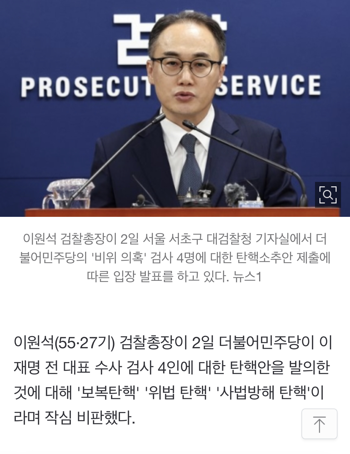 [여시뉴스데스크][속보] 검찰총장 “검사 탄핵, 이재명 재판 못하게 만들려는 것” 작성자대한민국 전정부실|작성시간24.07.02|조회수988 목록 댓글 14 글자크기 작게가 글자크기 크게가 출처: https://n.news.naver.com/article/025/0003370741?sid=102[속보] 검찰총장 “검사 탄핵, 이재명 재판 못하게 만들려는 것”이원석(55·27기) 검찰총장이 2일 더불어민주당이 이재명 전 대표 수사 검사 4인에 대한 탄핵안을 발의한 것에 대해 '보복탄핵' '위법 탄핵' '사법방해 탄핵'이라며 작심 비판했다. 이 총장은 이날 n.news.naver.com 다음검색 현재 게시글 추가 기능 열기 북마크 공유하기 신고 센터로 신고 댓글 댓글 14 댓글쓰기 답글쓰기 댓글 리스트 작성자엥다터져서왔다구요 | 작성시간 24.07.02 ㄹㅈ한다 작성자동네소금빵집 | 작성시간 24.07.02 진짜 미친놈들이네 작성자덩기더럭 | 작성시간 24.07.02 정치검찰짓하는거에 대한 책임을 져야지 작성자가발들고튀어 | 작성시간 24.07.02 이마빡 칠까 작성자배뱀배주세요 | 작성시간 24.07.02 머머리 댓글 전체보기