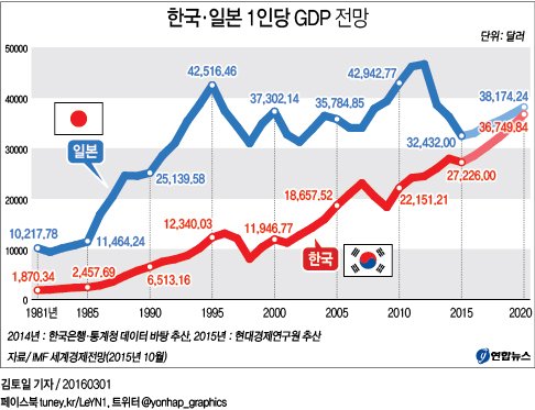 IMF 기준으로는 올해 즈음 한일 1인당 GDP 역전이 벌어질 거라 전망하던데