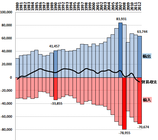 같은 해 일본의 수출액이 41조엔, 수입액이 33조엔 정도로