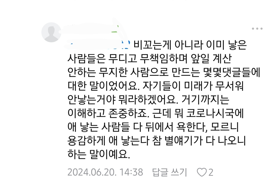 현실에서도 이 말 하니까 그건 너가 너무 오버하능거라고 한 애 바로 임신했드라ㅋㅋ -