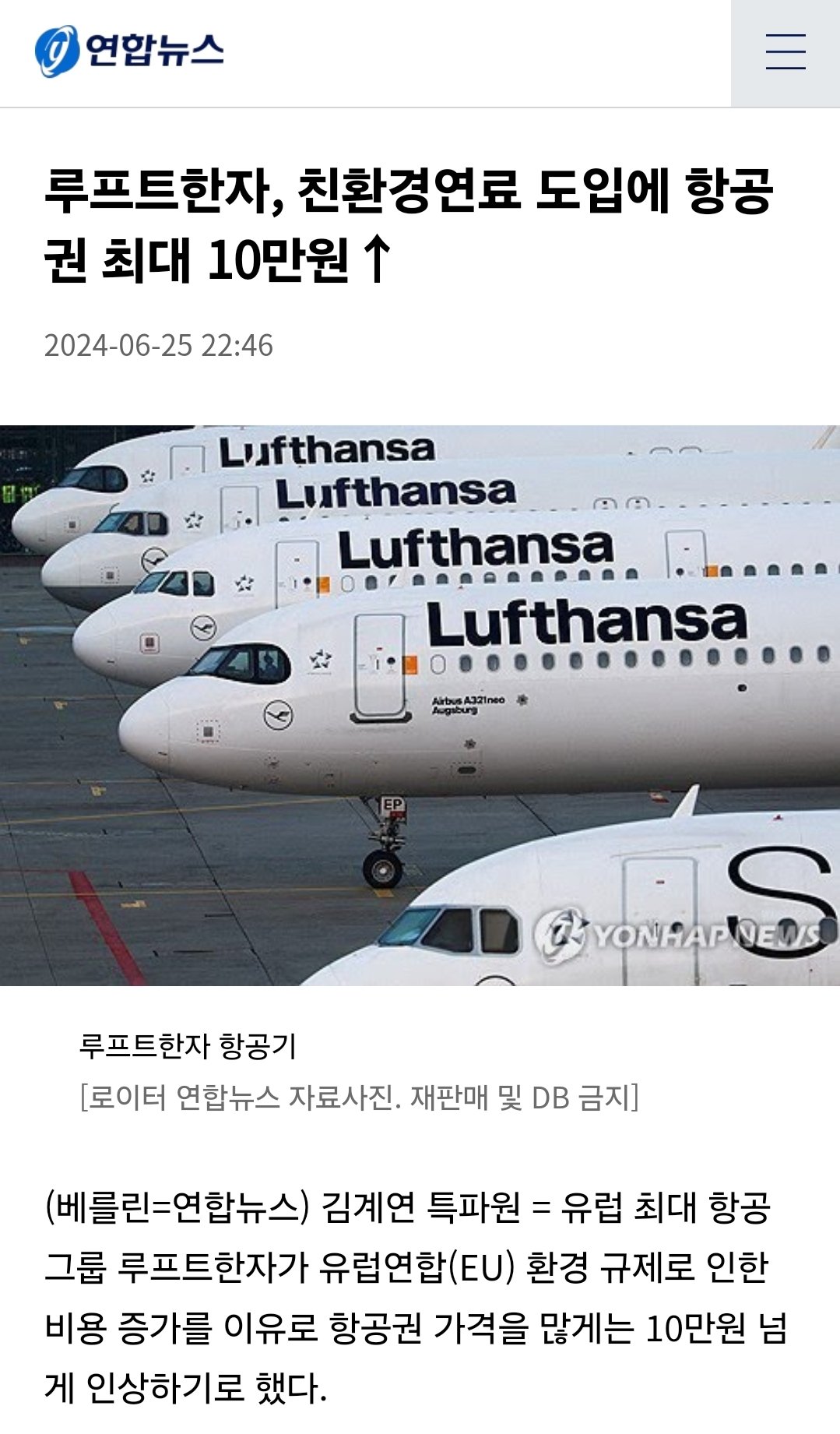 루프트한자는 환경규제에 대한 부담 비용 해소를 위해 내년부터 유럽연합(EU) 회원국과 영국·노르웨이·스위스에서 출발하는 모든 항공편에 최대 72유로(약 10만원)까지 추가 비용을 청구하기로 함
