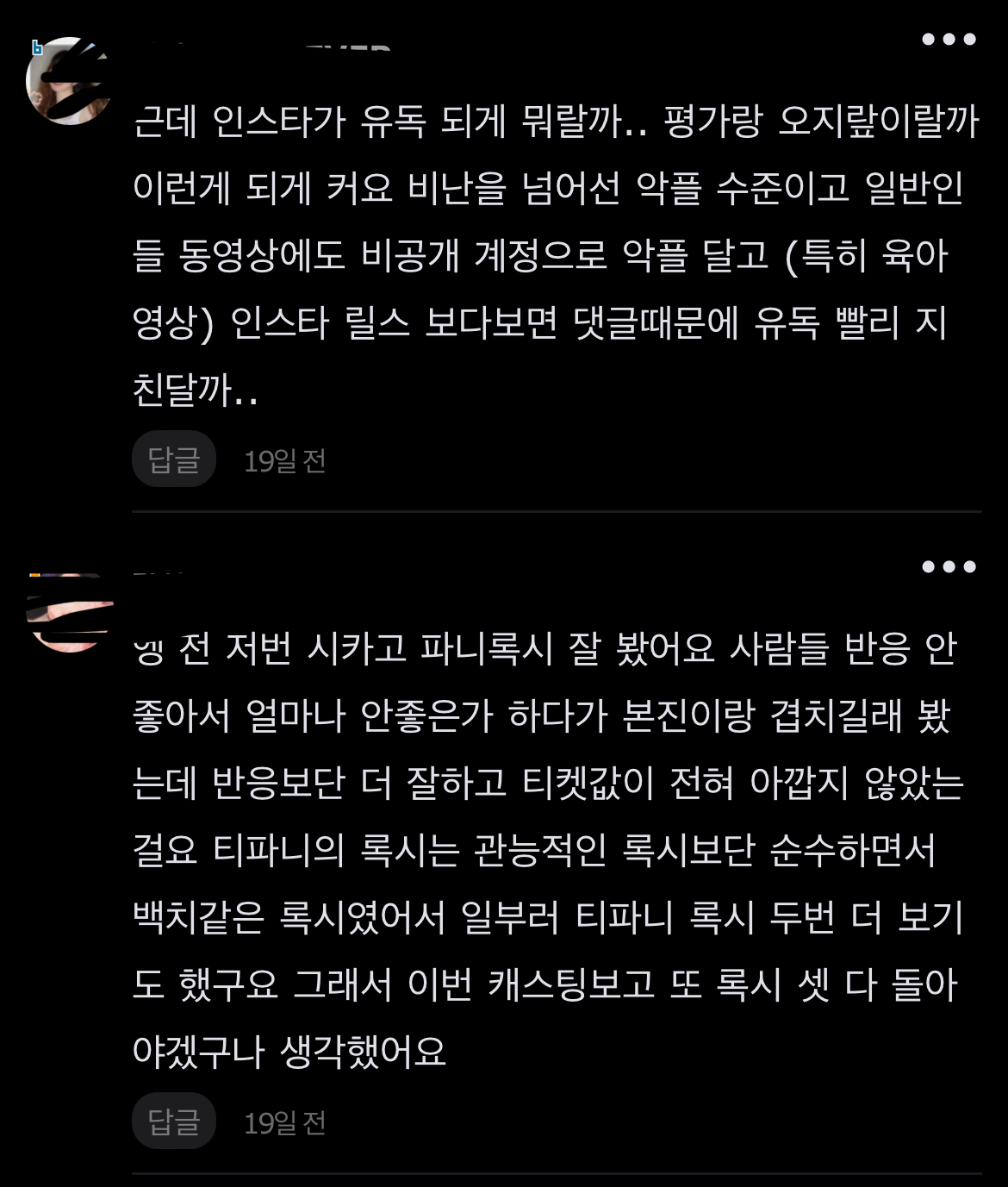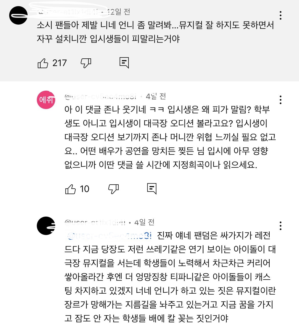 작성자뮤지컬 배우 박지연 작성시간 24.07.03 취향에 안 맞으면 안 보면 될 일.... 진짜 배우마다 다른걸 왜 알지도 못하면거 저러는지 모르겠어